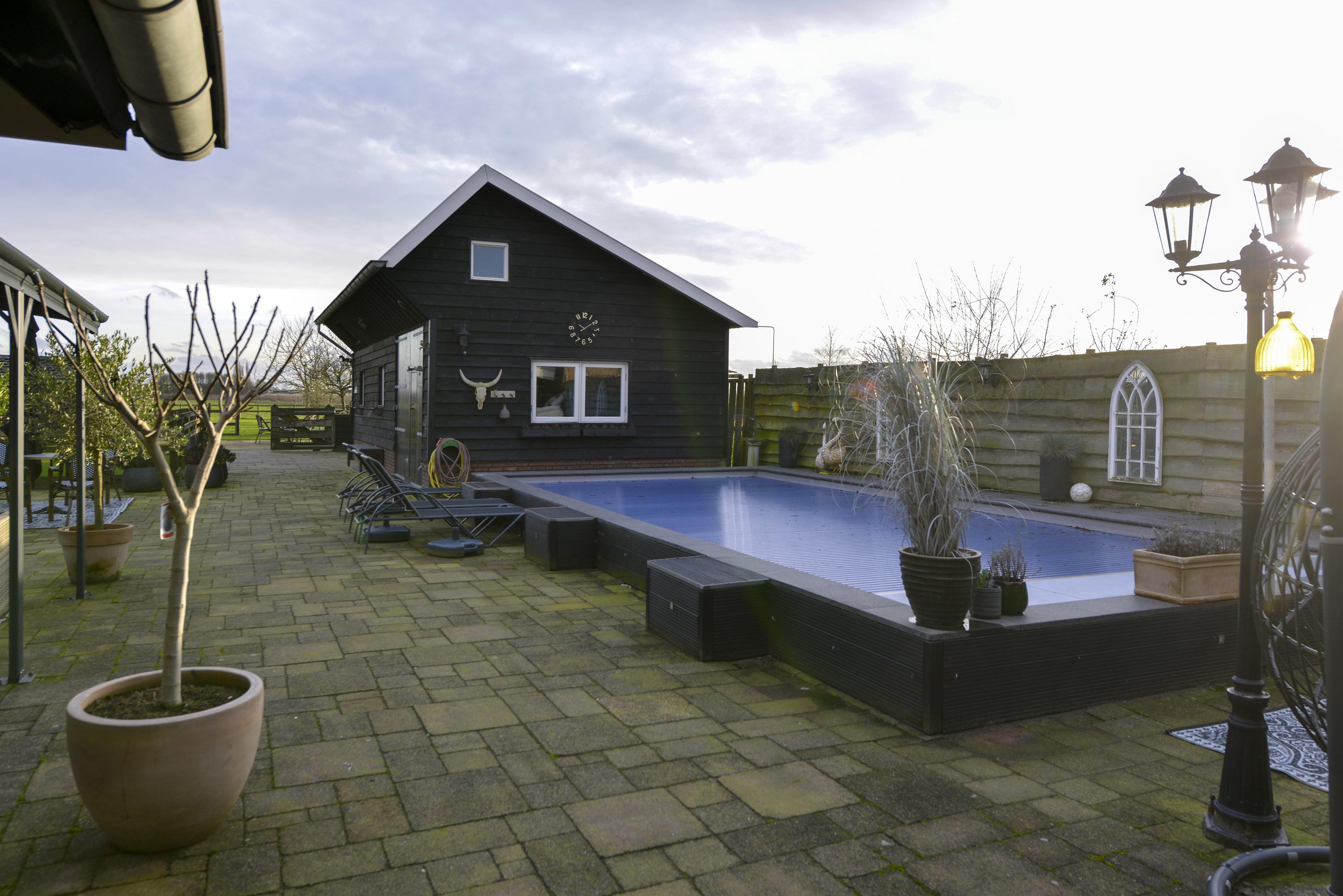 Tuin: diepe tuin met onder andere een overkapping met buitenkeuken, weiland met fruitbomen en een verwarmd zwembad.