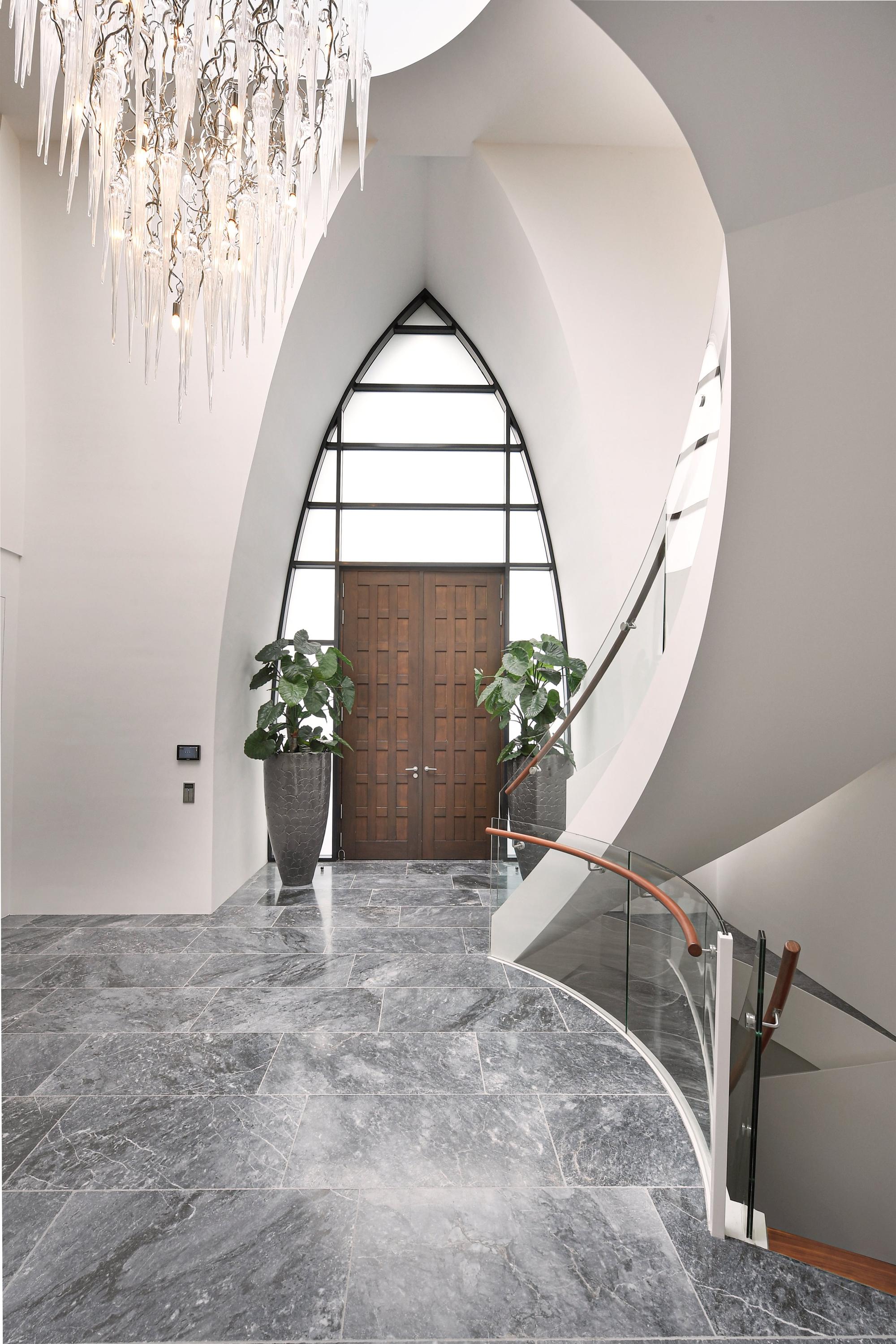De imposante entree met vide en dubbele deuren geeft direct een gevoel van grandeur.