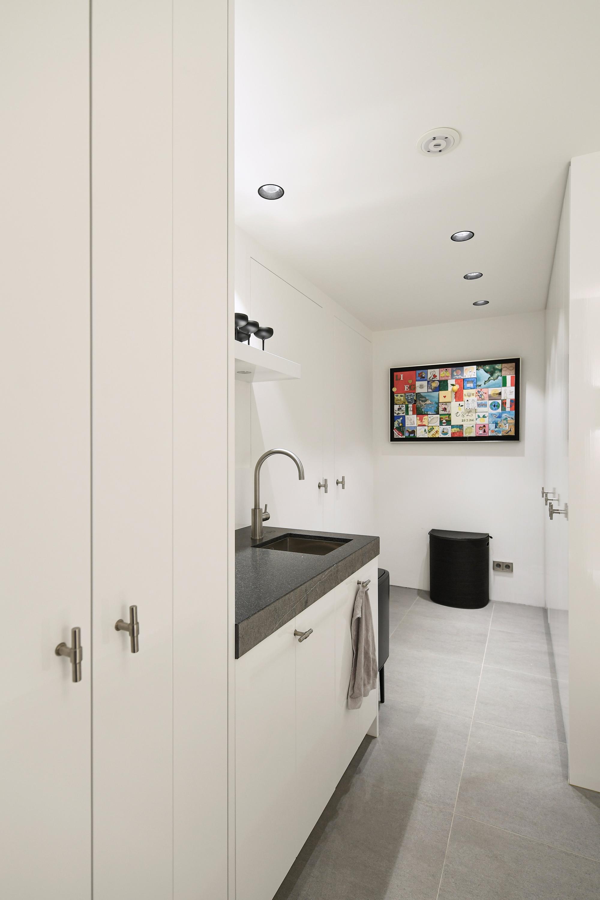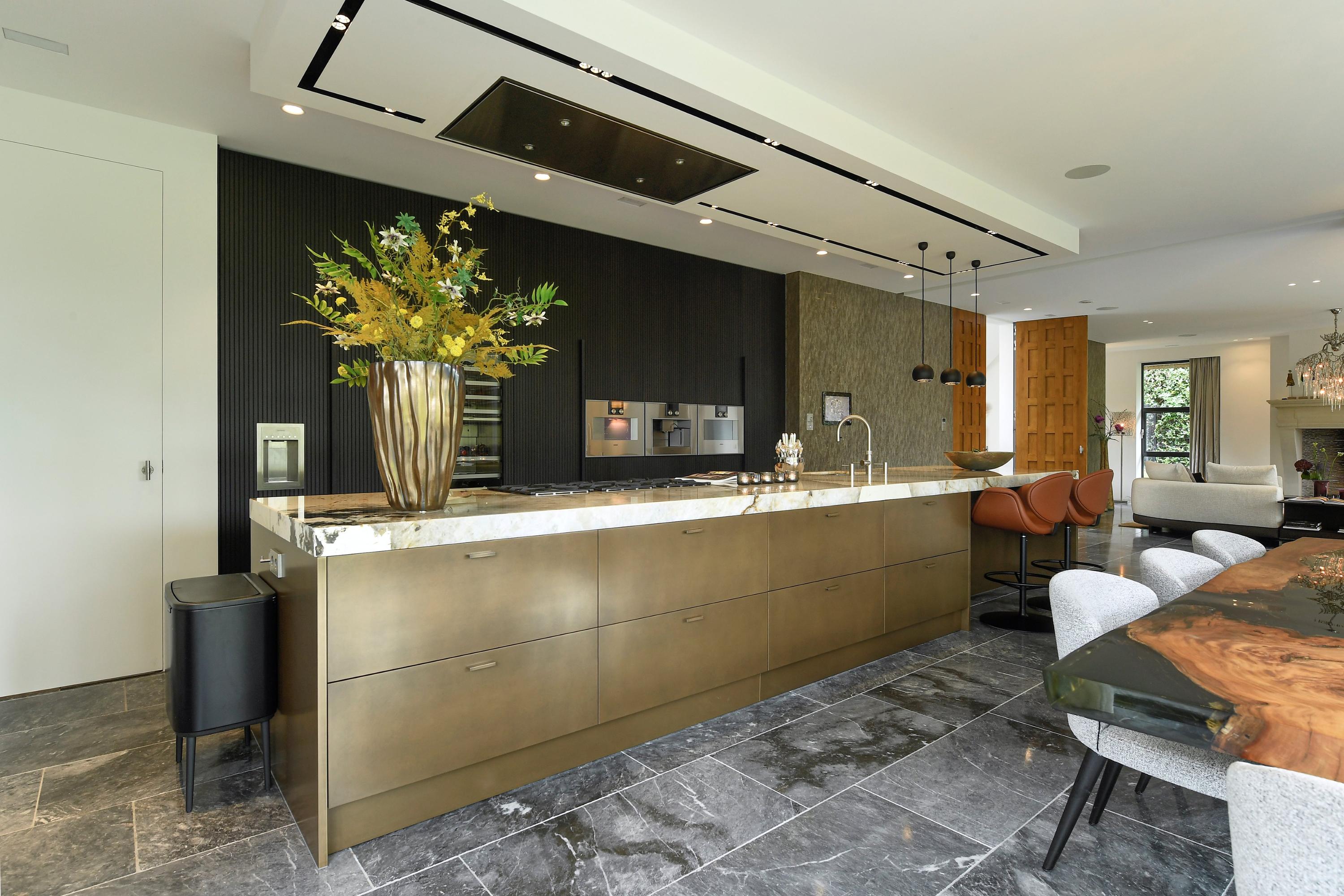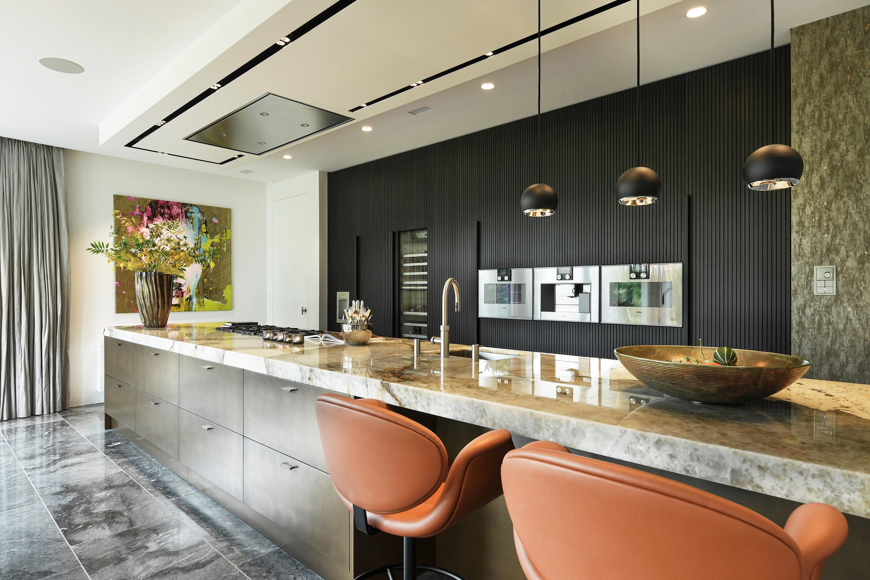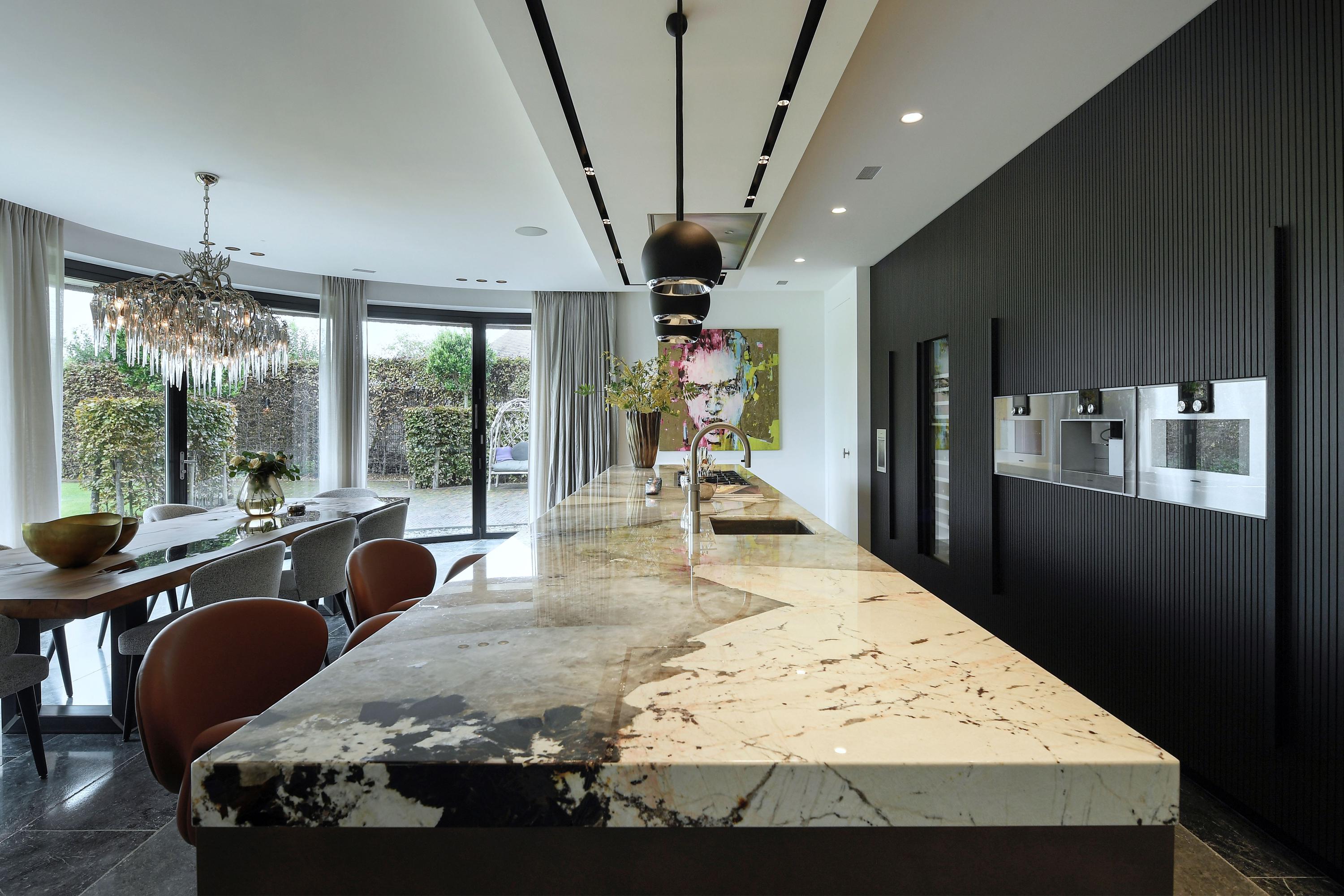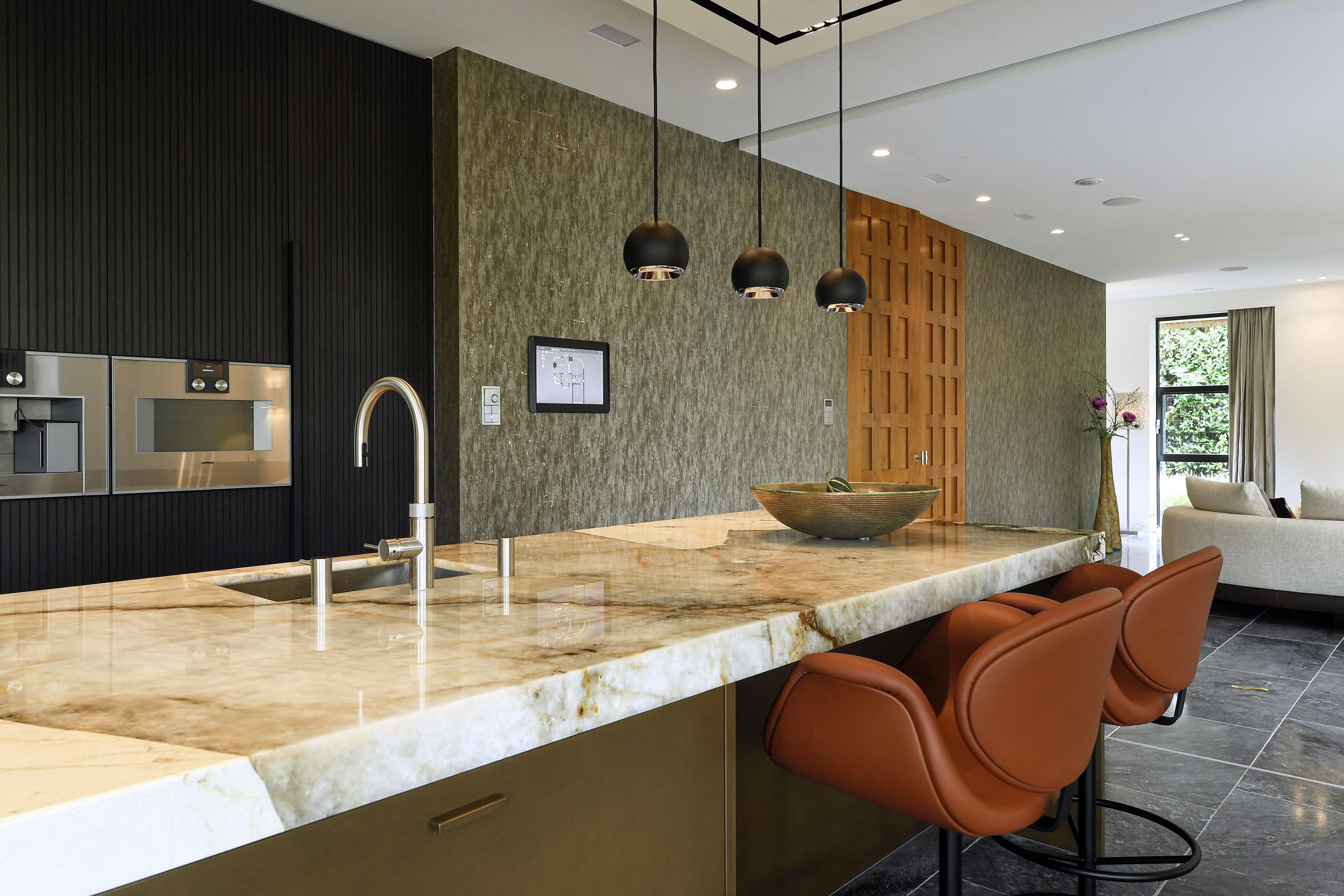 De leefkeuken is voorzien van een kook-/spoeleiland in Patagonia kwartsiet en apparatuur van Gaggenau.