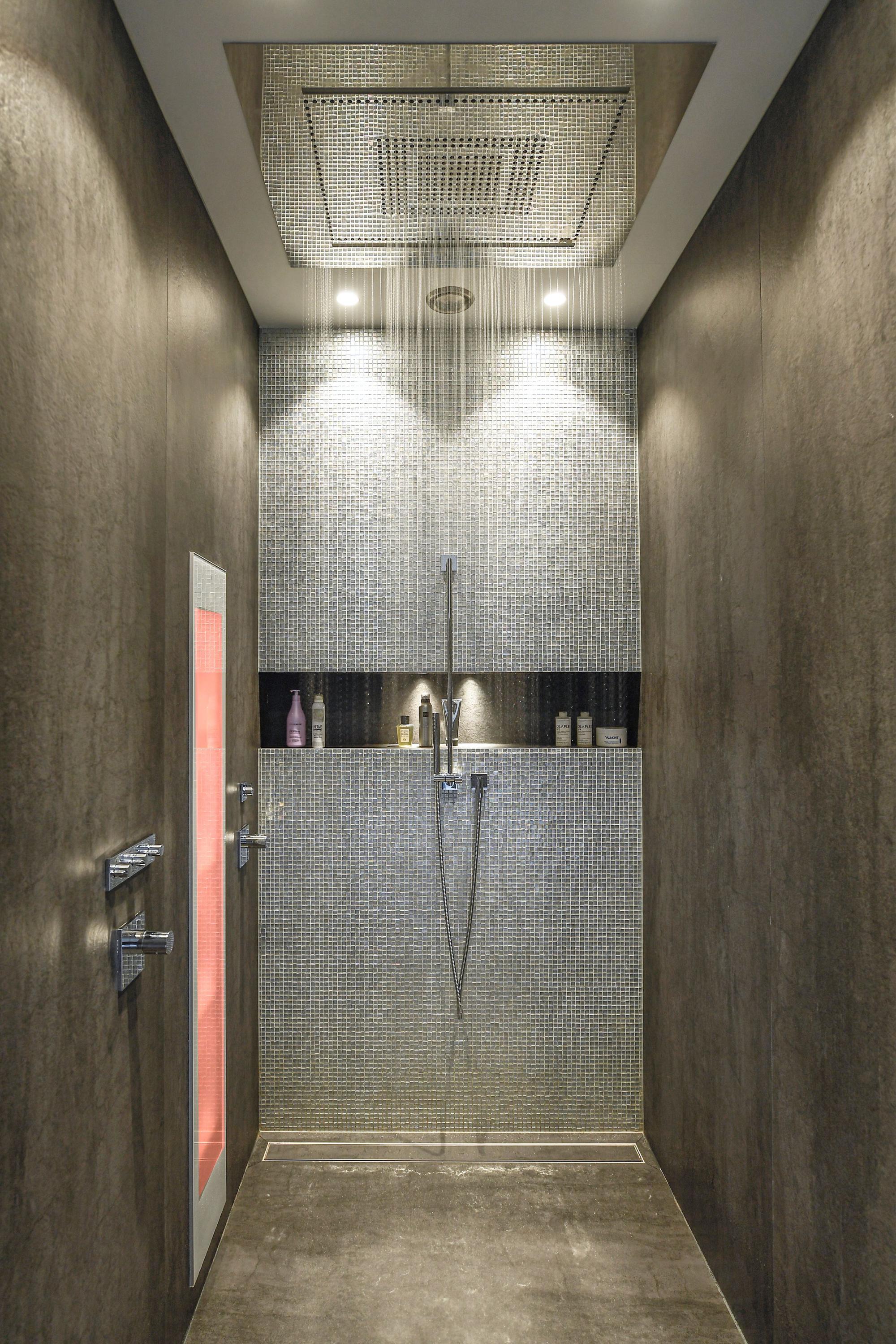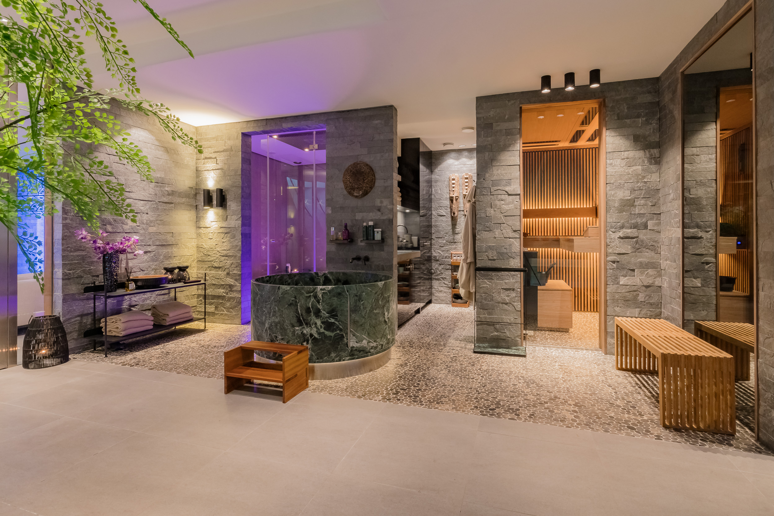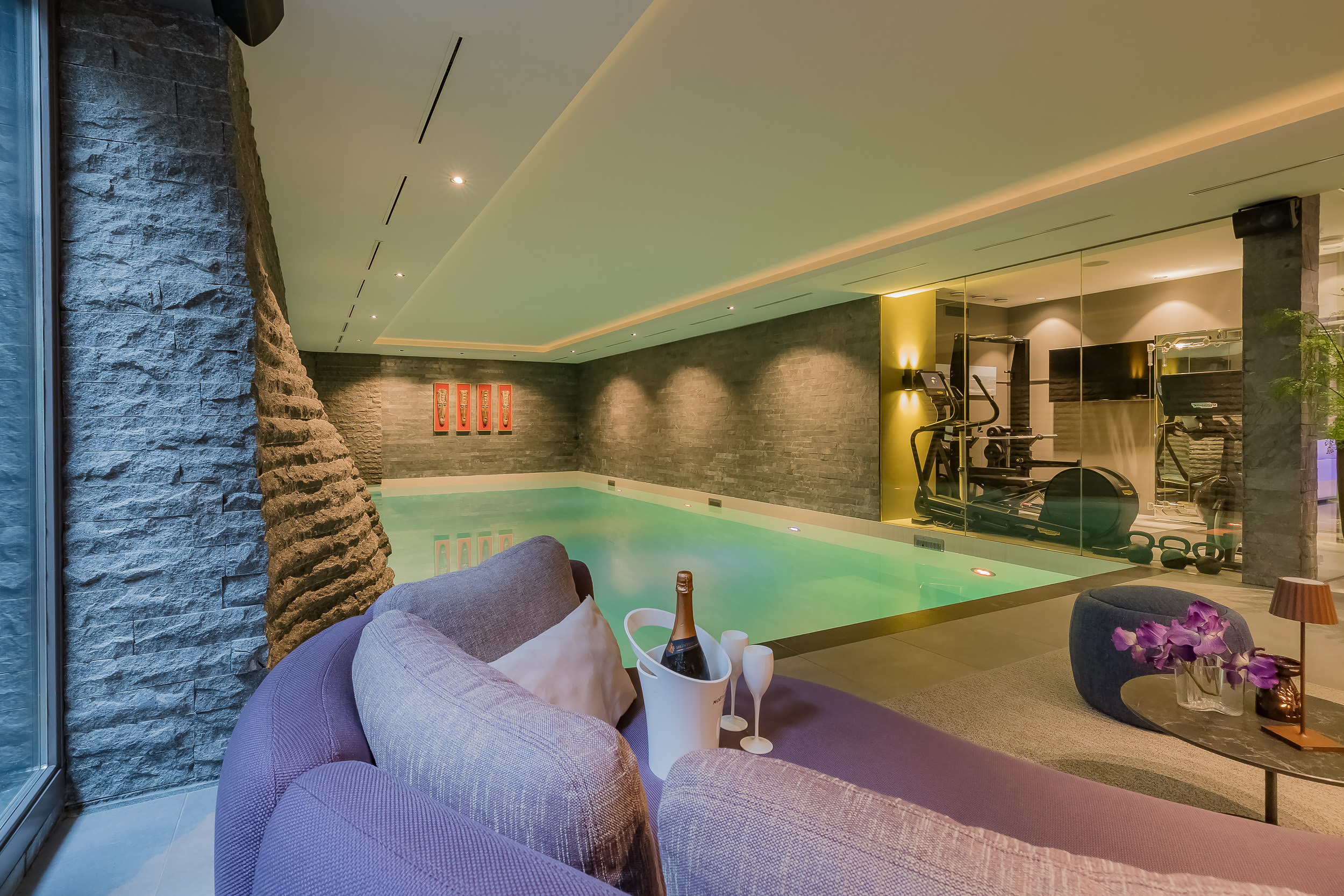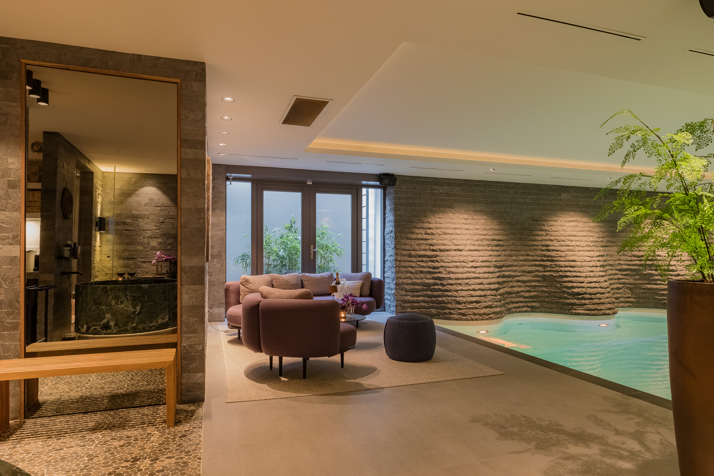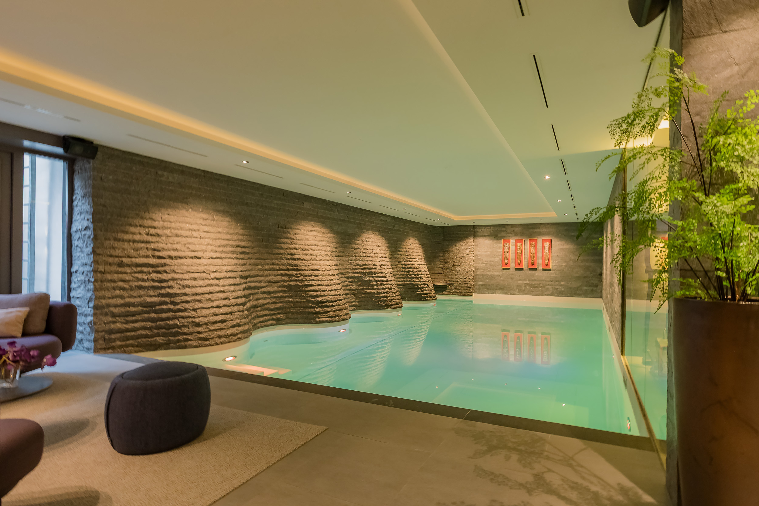 Het verwarmde binnenzwembad van 13 meter vormt het hart van deze verdieping – omgeven door wanden die golven als een berglandschap, met een subtiel verlichte waterval als blikvanger.