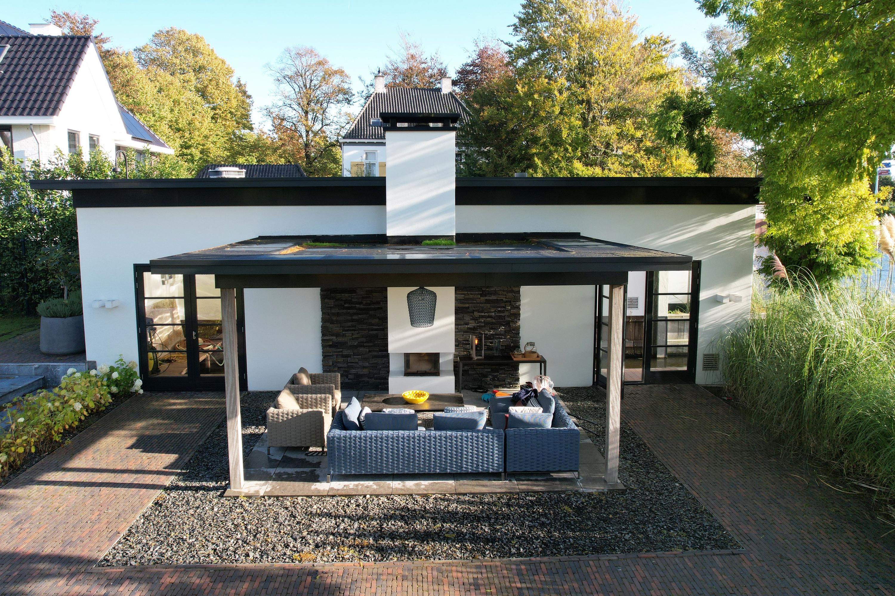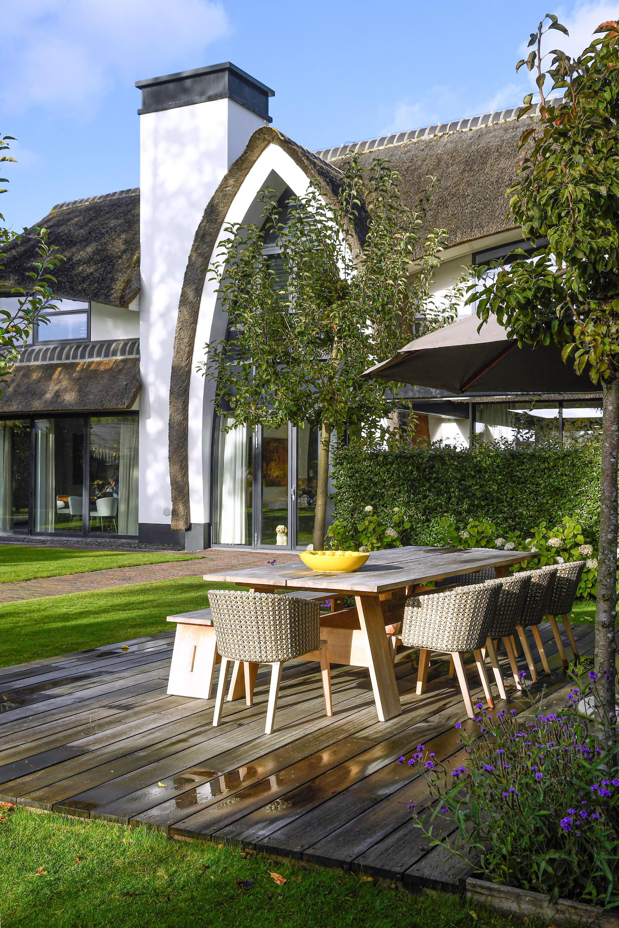 Met haar rieten kap, sculpturale lijnen en ligging aan het water is deze villa een herkenningspunt in de regio - ontworpen door Van Manen Architecten, bekend om hun tijdloze en elegante stijl.