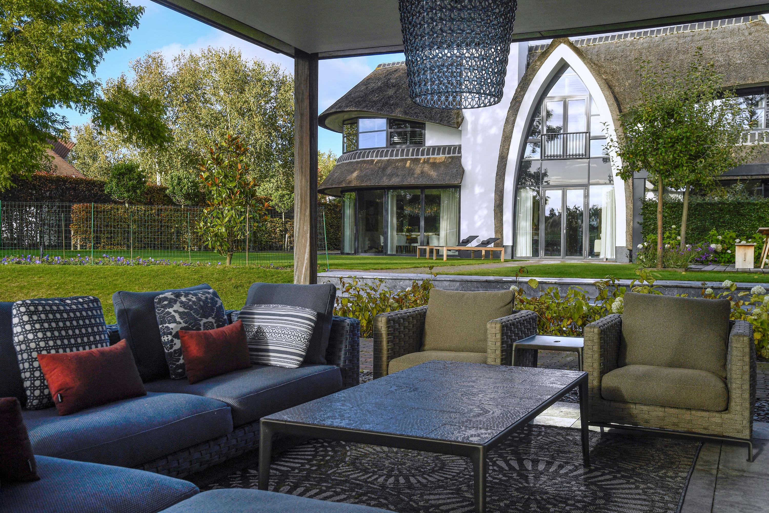 Hoge raampartijen en openslaande deuren zorgen voor een naadloze overgang tussen binnen en buiten.