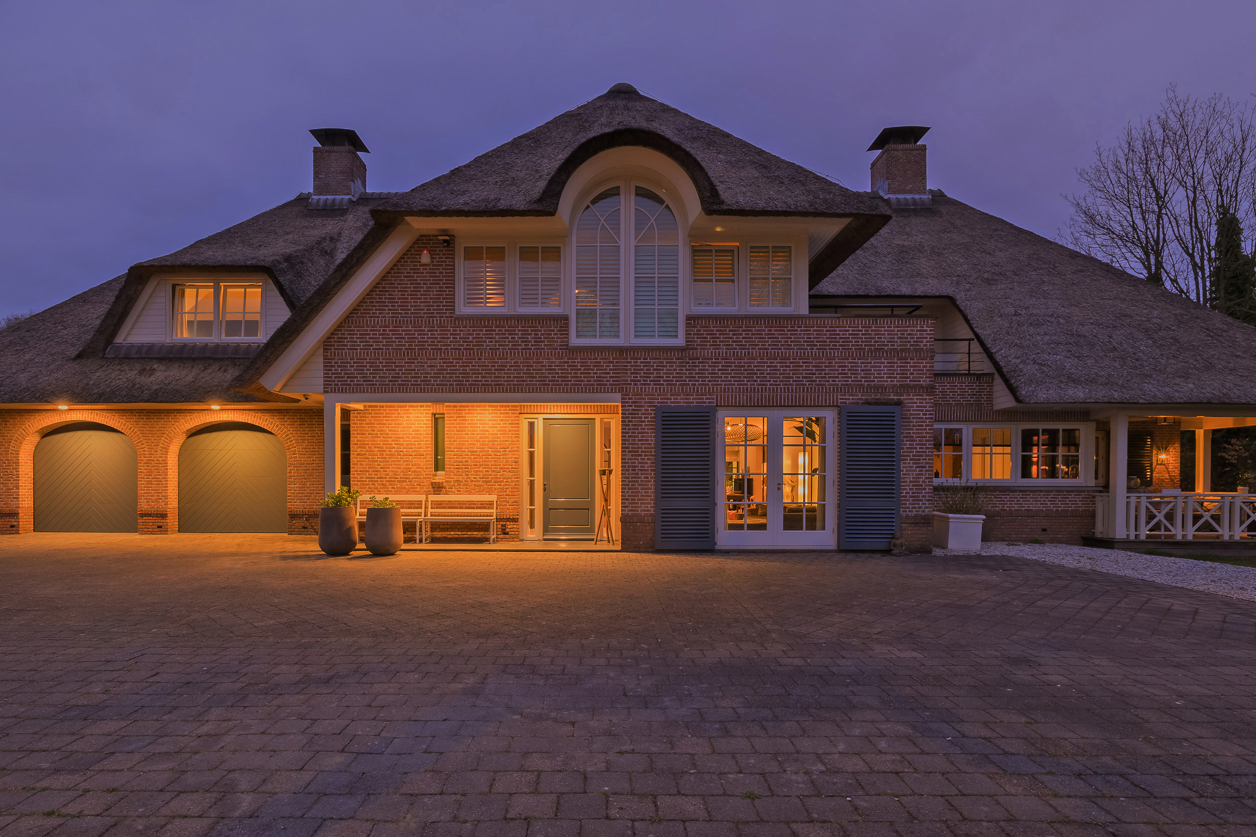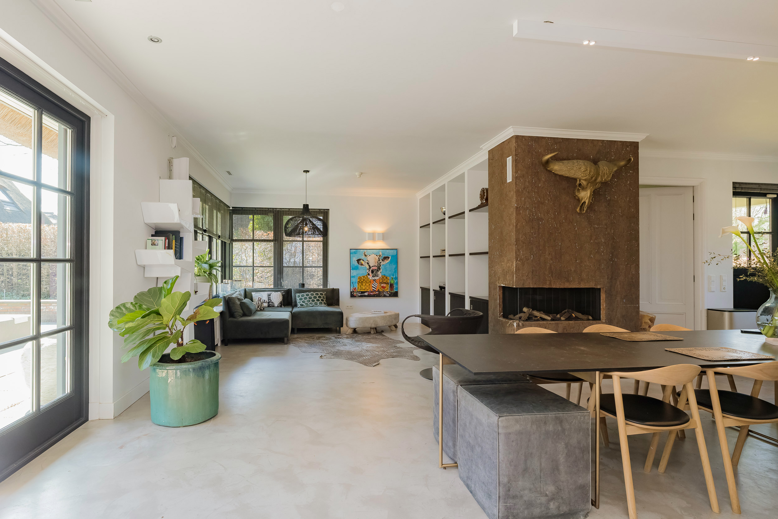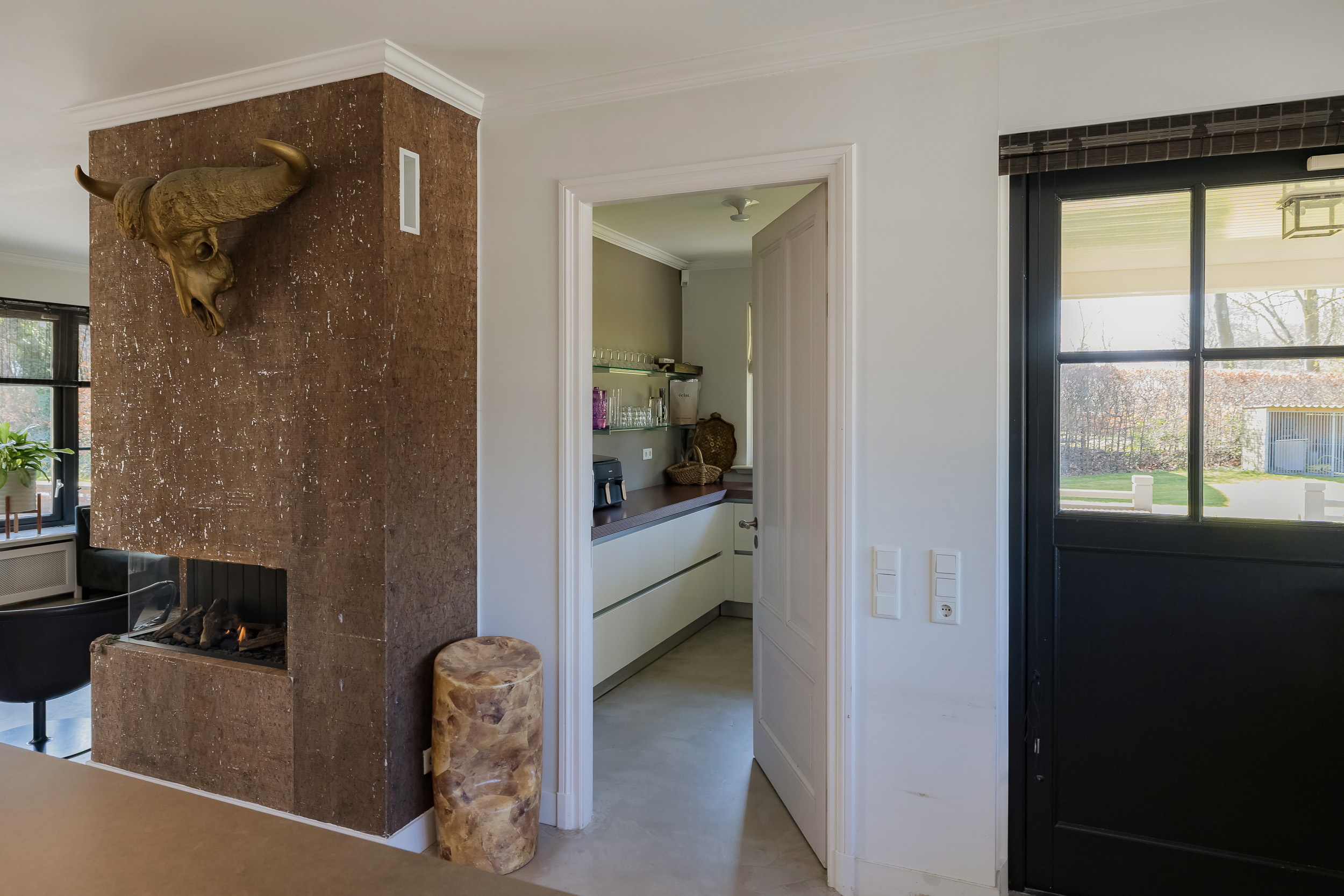 Stap binnen in de ruime hal met gastentoilet en voel direct de stijlvolle sfeer die door de hele woning doorgetrokken is. De royale living met een prachtige zandstenen open haard en grote ramen biedt een fantastisch uitzicht op de rondom gelegen tuin. Voor gezellige filmavonden is er een aparte tv-kamer direct rechts bij de entree. De fraaie betonlook vloer (hal en woonkeuken), luxe stalen deuren en de high-end keuken met werkeiland en hoogwaardige apparatuur zorgen voor een moderne, maar warme uitstraling. In de woonkeuken is verder een heerlijke zit gecreëerd, met toegang en zicht op de tuin en een moderne gasopenhaard. Verder vind je op de begane grond een praktische bijkeuken, dubbele garage, en heb je toegang tot een ruime veranda en een groot terras, waar je volop kunt genieten van buiten.