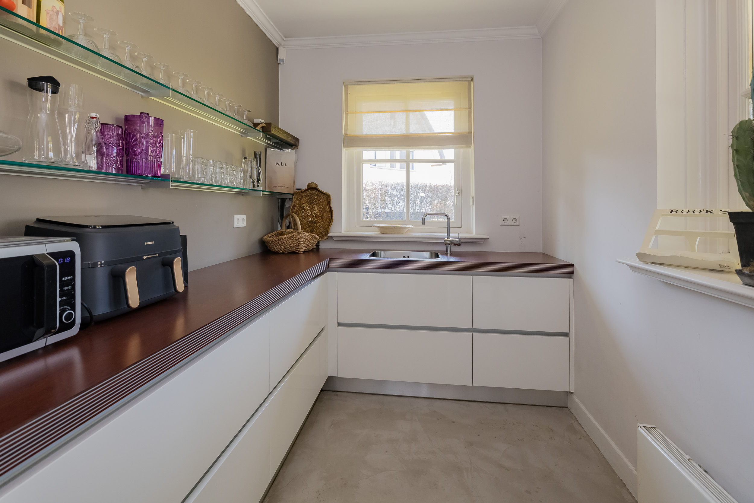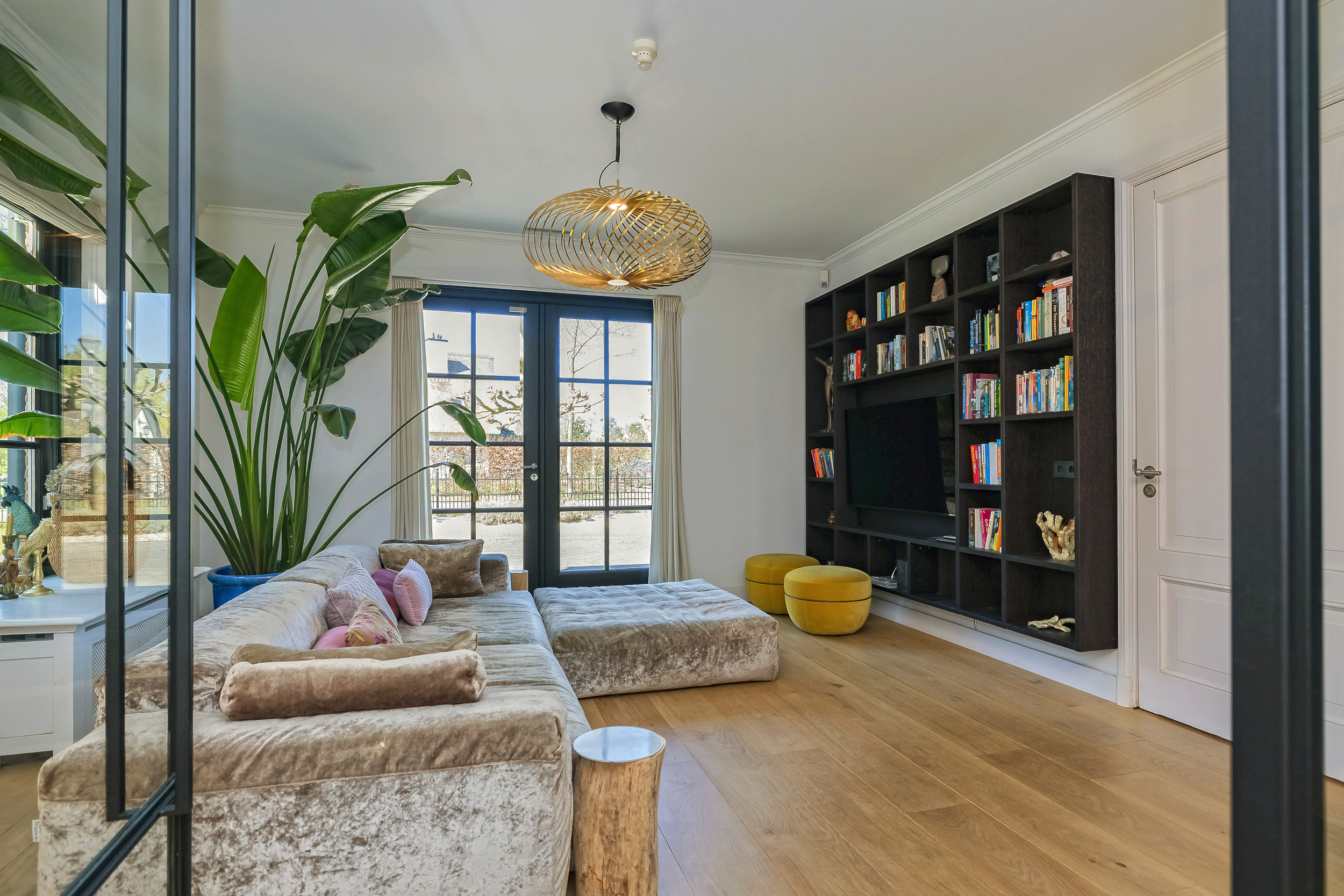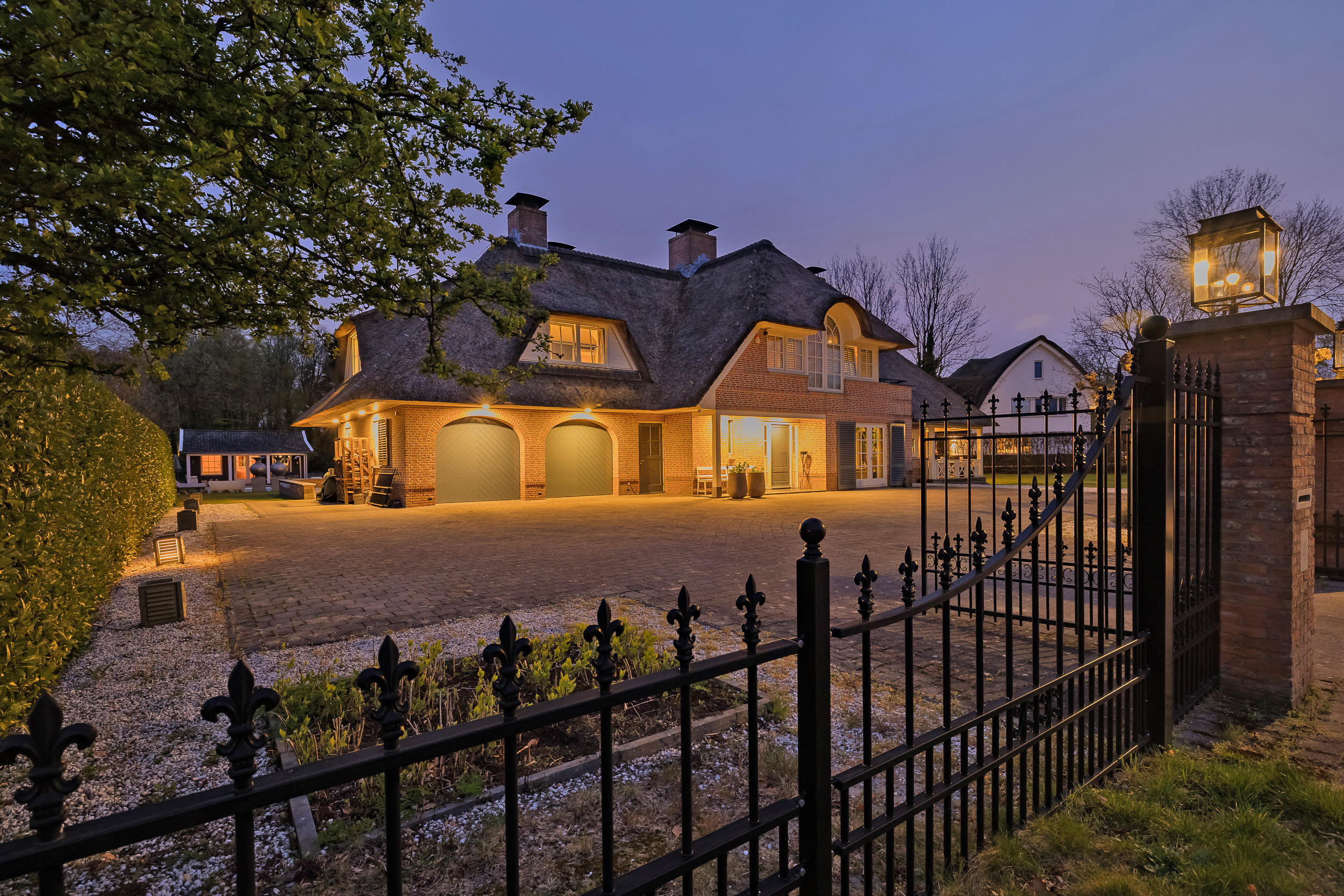 Stap binnen in de ruime hal met gastentoilet en voel direct de stijlvolle sfeer die door de hele woning doorgetrokken is. De royale living met een prachtige zandstenen open haard en grote ramen biedt een fantastisch uitzicht op de rondom gelegen tuin. Voor gezellige filmavonden is er een aparte tv-kamer direct rechts bij de entree. De fraaie betonlook vloer (hal en woonkeuken), luxe stalen deuren en de high-end keuken met werkeiland en hoogwaardige apparatuur zorgen voor een moderne, maar warme uitstraling. In de woonkeuken is verder een heerlijke zit gecreëerd, met toegang en zicht op de tuin en een moderne gasopenhaard. Verder vind je op de begane grond een praktische bijkeuken, dubbele garage, en heb je toegang tot een ruime veranda en een groot terras, waar je volop kunt genieten van buiten.