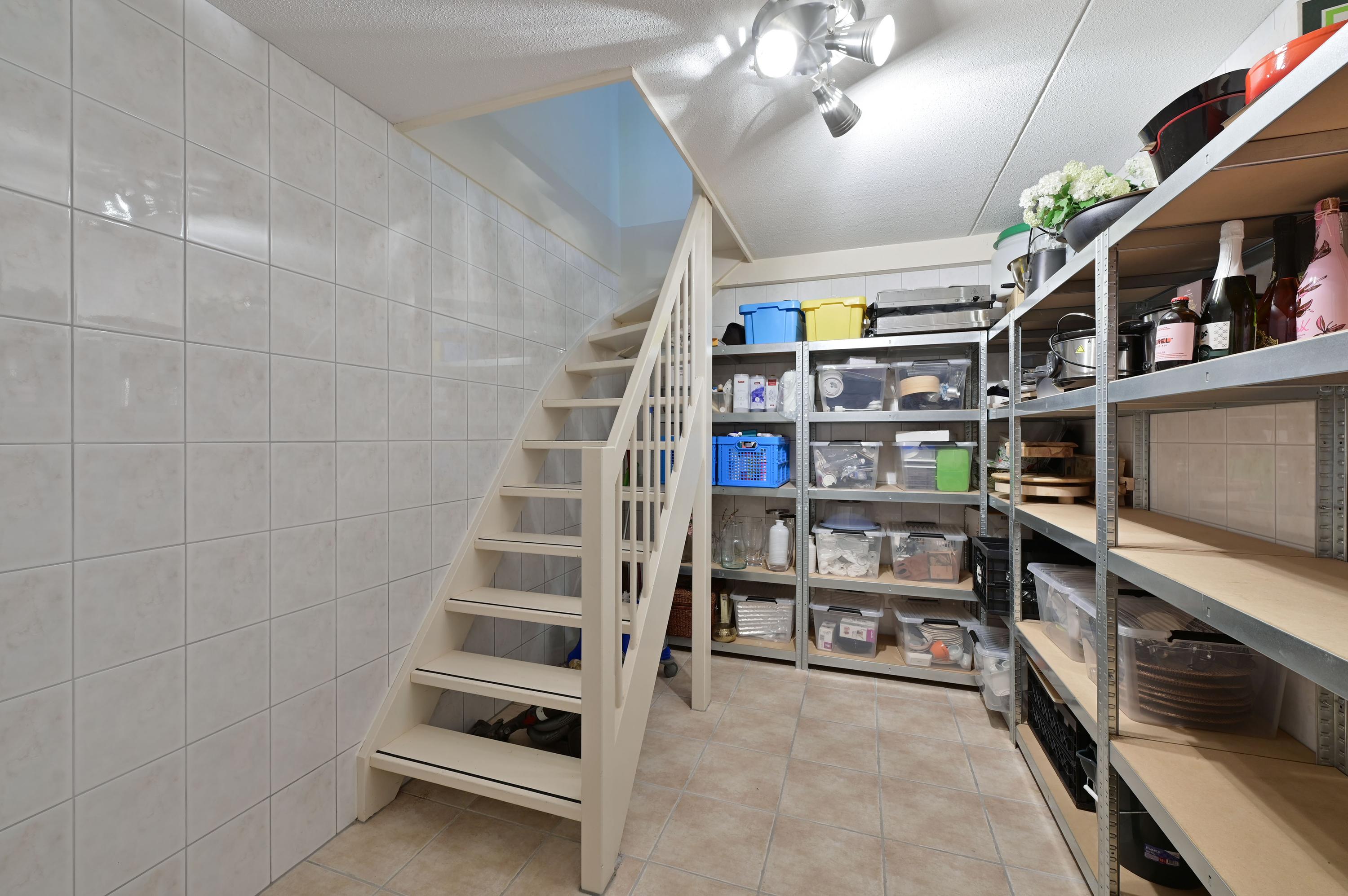 Vanuit de keuken is er toegang tot een diepe, droge kelder met stahoogte – perfect als voorraadruimte of wijnkelder. Ook de praktische bijkeuken grenst aan de keuken, met aansluitingen voor de wasmachine en de wasdroger, een uitstortgootsteen en plek voor een extra koelkast. Vanuit hier is er tevens toegang tot de op het zuiden gelegen achtertuin.