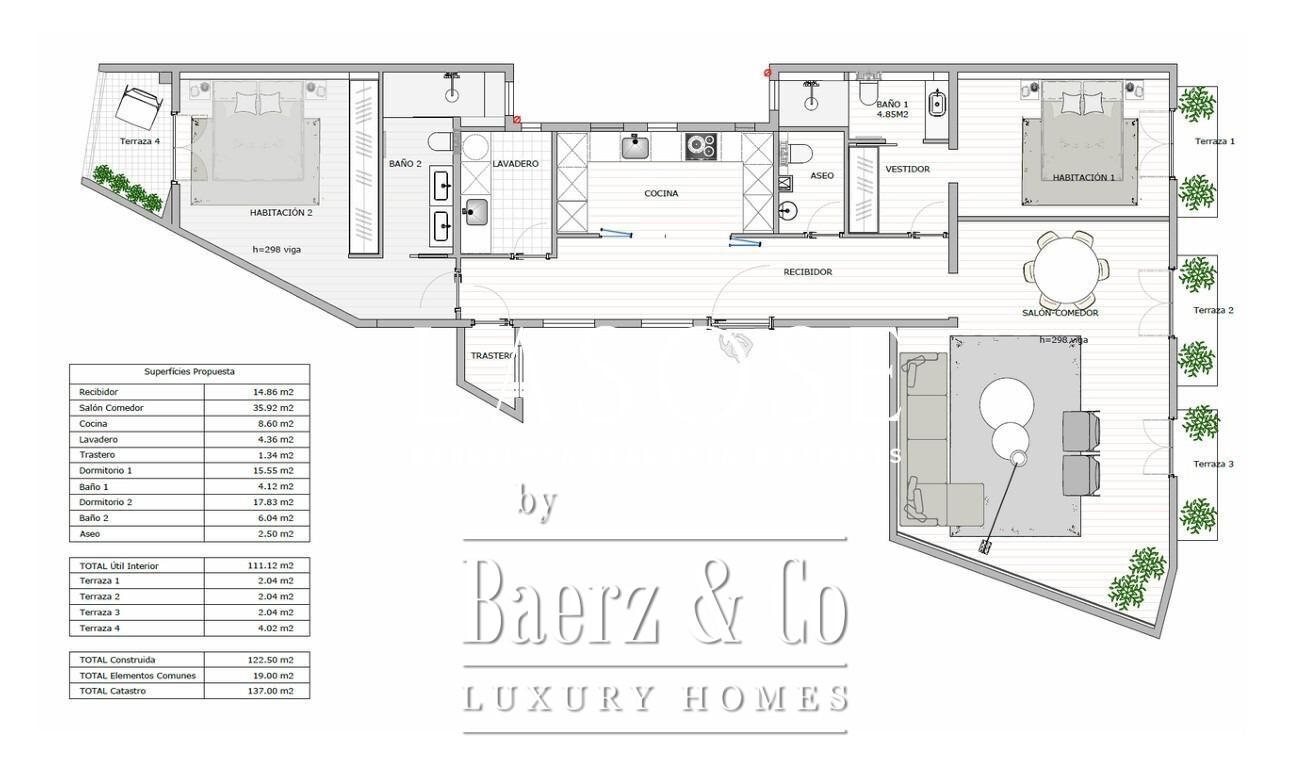 Две просторные спальни создают атмосферу уединения, при этом основной люкс дополнен встроенной галереей, наполняющей помещение теплом и естественным освещением. В квартире две ванные комнаты и отдельный гостевой санузел; продуманные детали — гардеробные, прачечная и постирочная — повышают ежедневный комфорт. В распоряжении жителей также терраса, а доступ к квартире осуществляется по лифту.