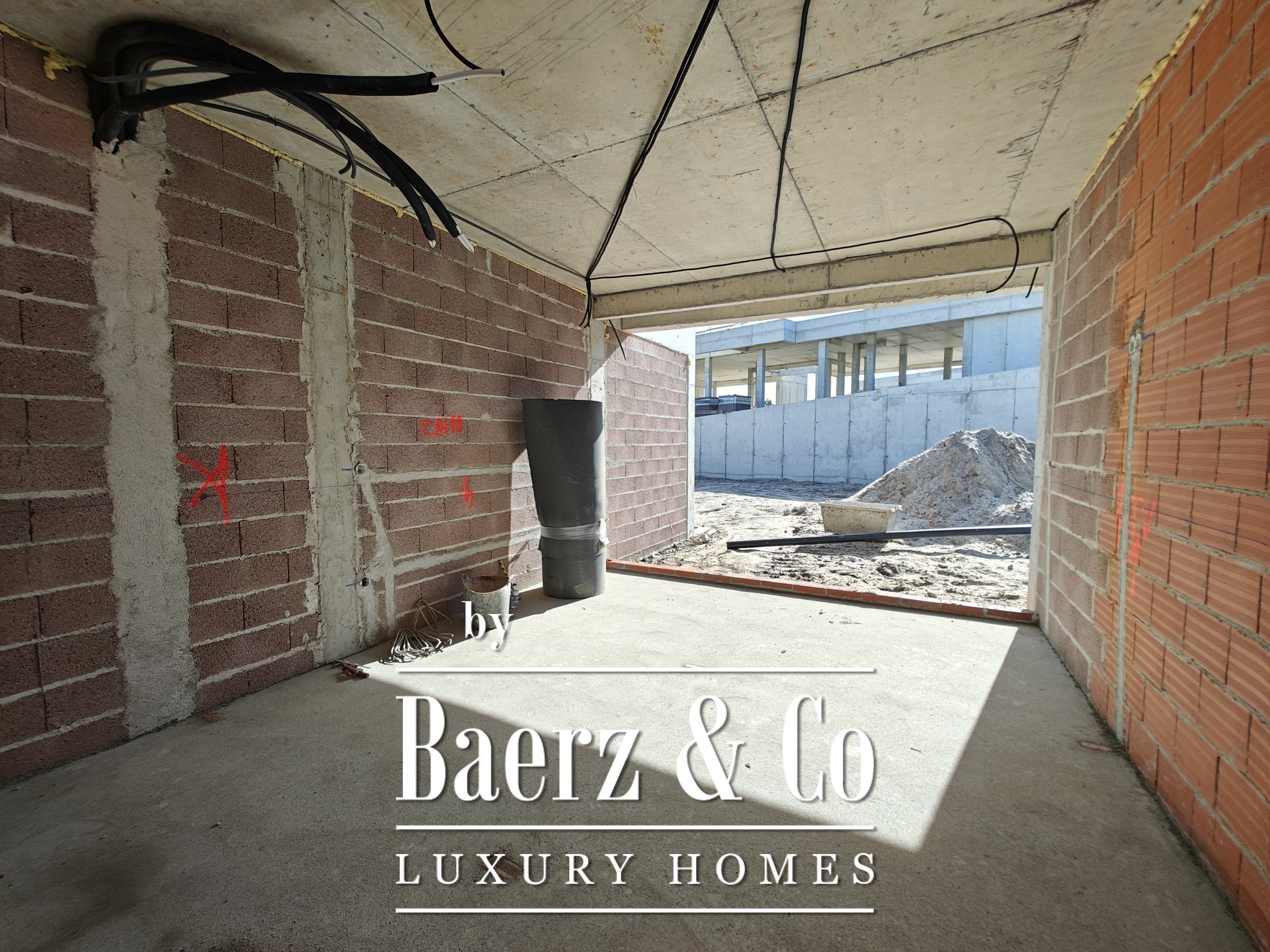 Интерьер виллы отличает продуманная детализация, высококлассные материалы и экологический подход. Полы из многослойного натурального дерева сочетают в себе тепло и прочность. Крупные алюминиевые профили с двухкамерным остеклением обеспечивают тепловой и акустический комфорт и поддерживают энергоэффективность класса A+. Климат регулируется с помощью тепловой системы BOSCH Compress с тепловым насосом, подогревом полов и вентиляцией VMC; предусмотрена готовность к установке видеонаблюдения и солнечных панелей. Кухня оснащена техникой Miele; навес для автомобилей рассчитан на две машины, отличаясь сдержанным и элегантным обликом.
