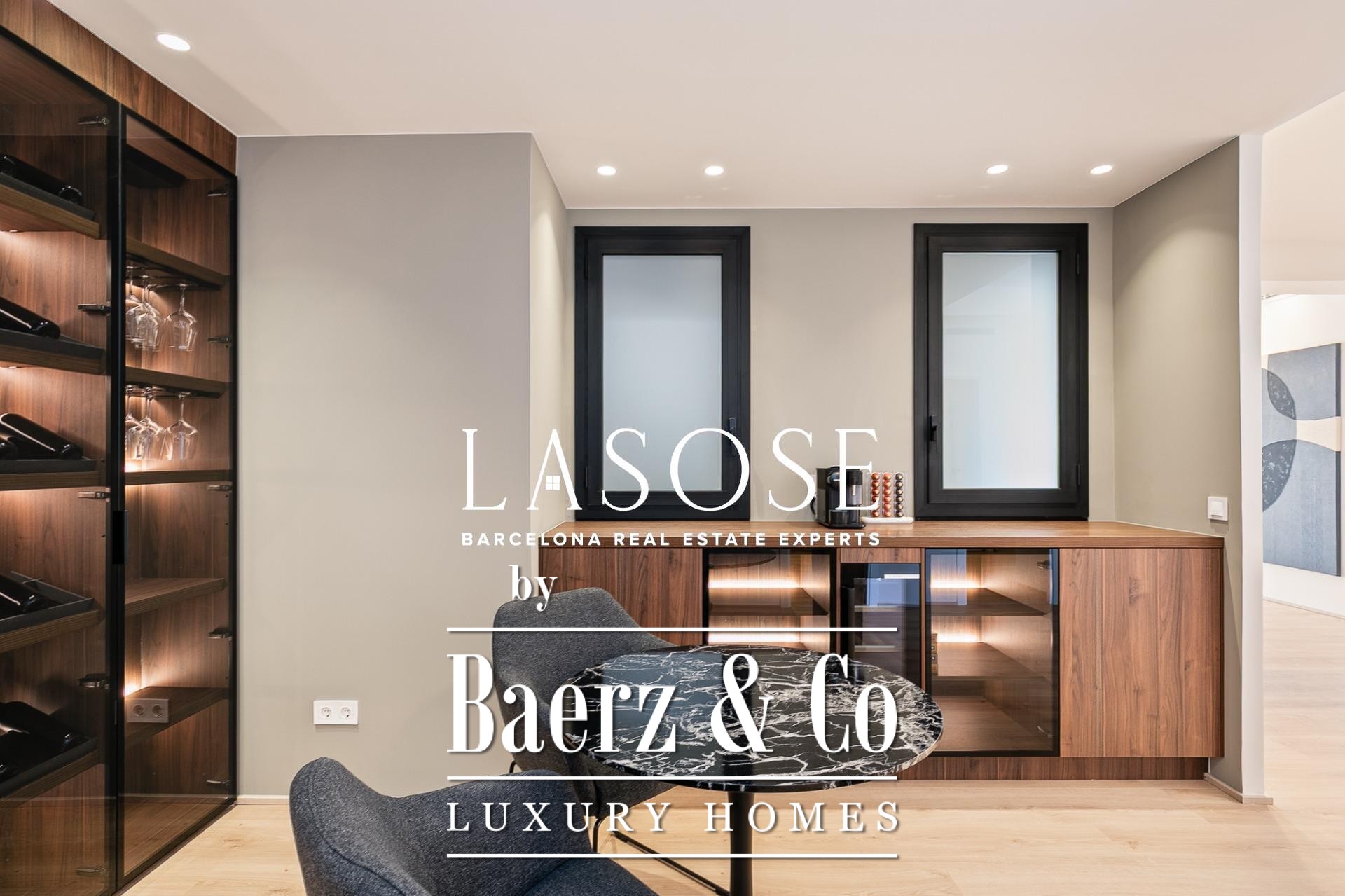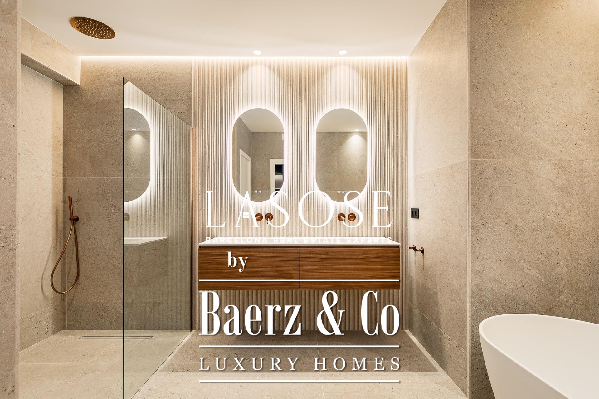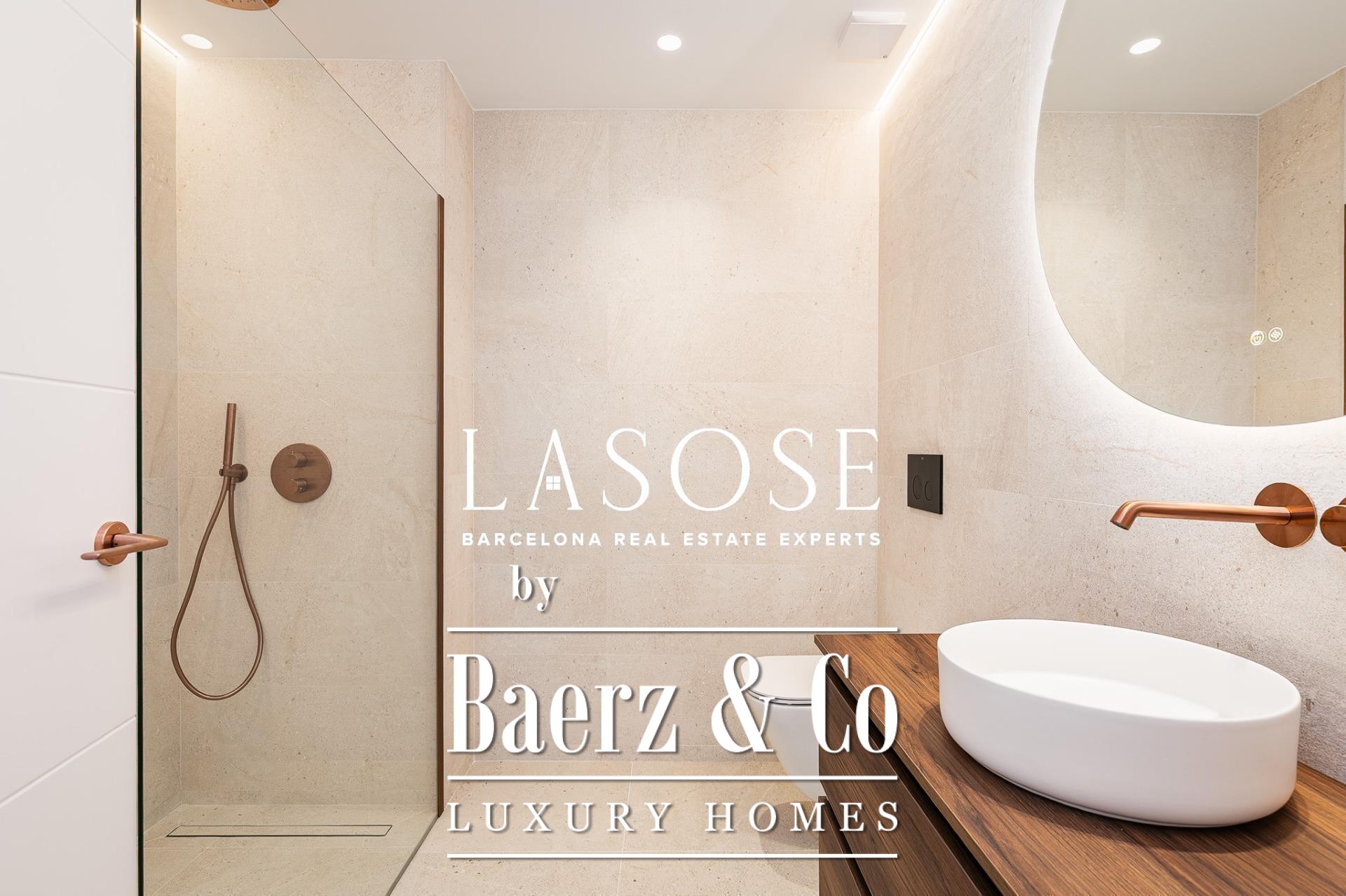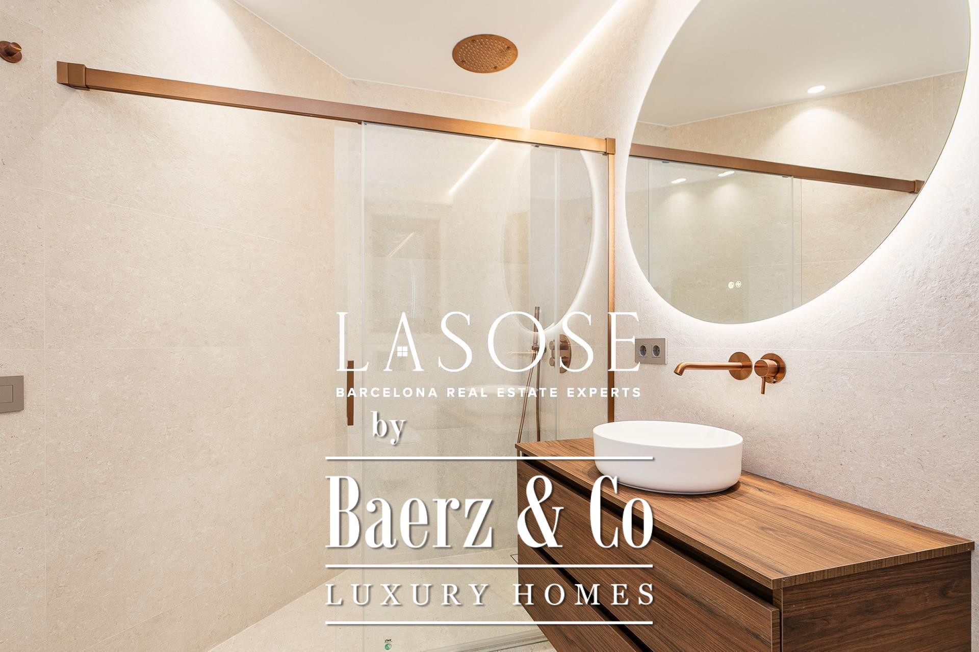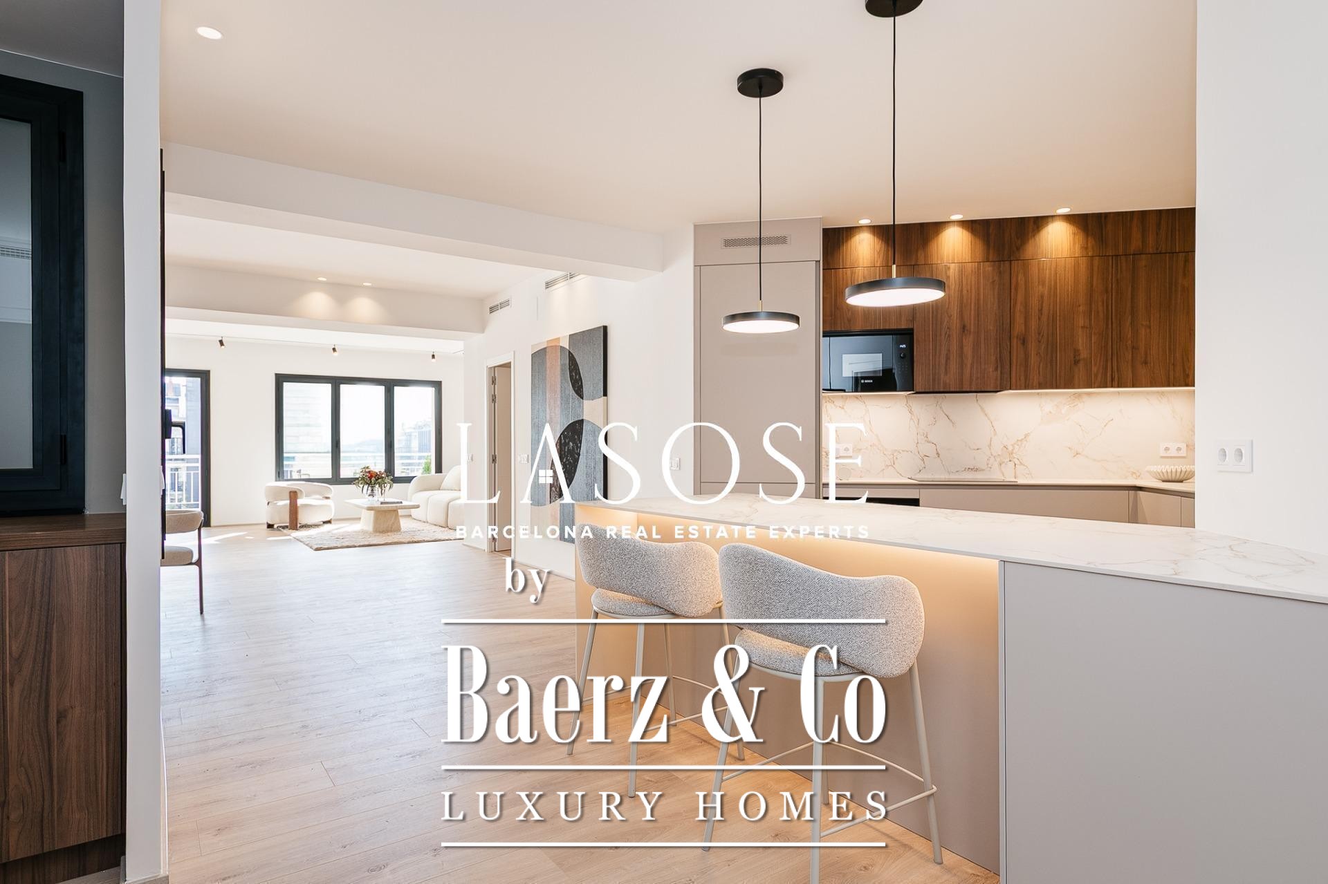 公寓经过全面翻新,甄选高端材质。宽大的东南朝向落地窗让阳光洒满慷慨的室内空间以及开放式的90平方米客餐厅。起居室的门直通转角全景露台,可俯瞰绿树成荫的林荫大道与Plaça Mossèn Jacint Verdaguer广场。厨房由Santos设计,配备Bosch家电,中心为社交中岛,内设酒窖与咖啡区,旁设储藏室,保证收纳私密。