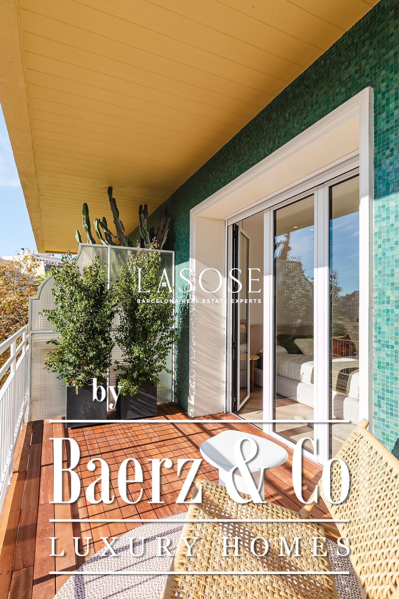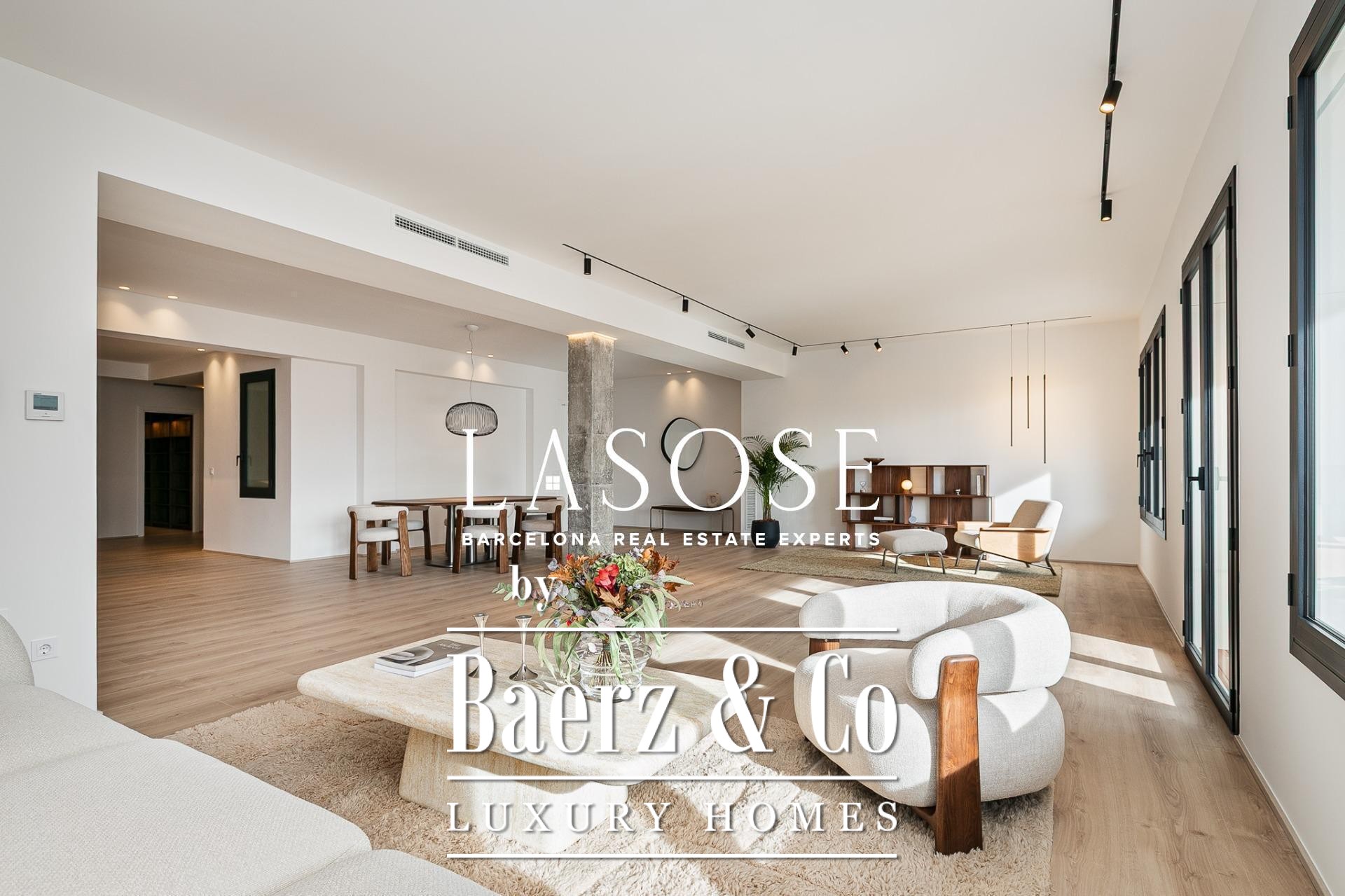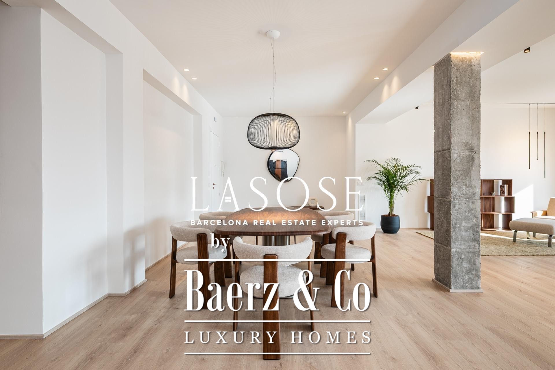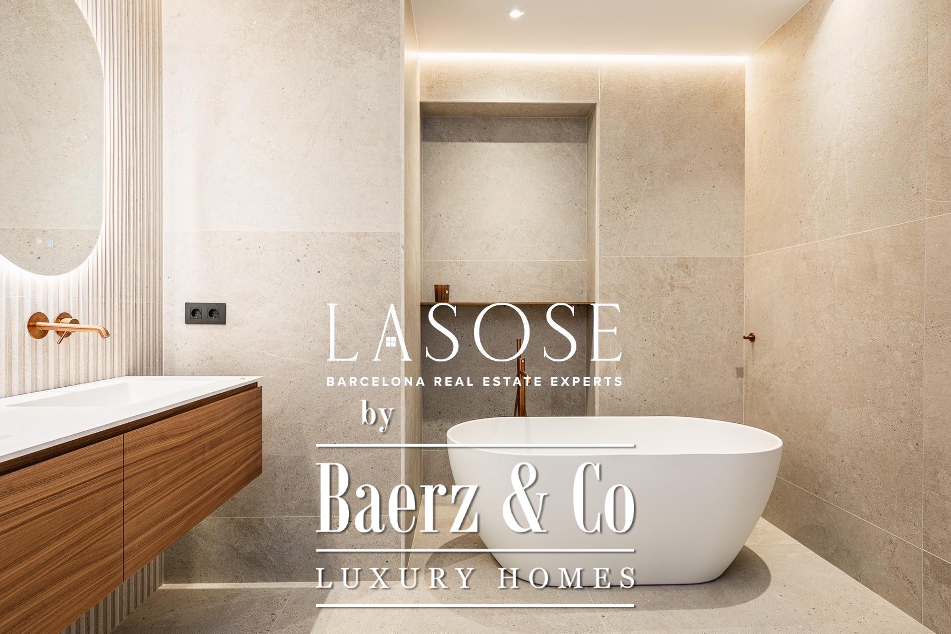 公寓经过全面翻新,甄选高端材质。宽大的东南朝向落地窗让阳光洒满慷慨的室内空间以及开放式的90平方米客餐厅。起居室的门直通转角全景露台,可俯瞰绿树成荫的林荫大道与Plaça Mossèn Jacint Verdaguer广场。厨房由Santos设计,配备Bosch家电,中心为社交中岛,内设酒窖与咖啡区,旁设储藏室,保证收纳私密。
