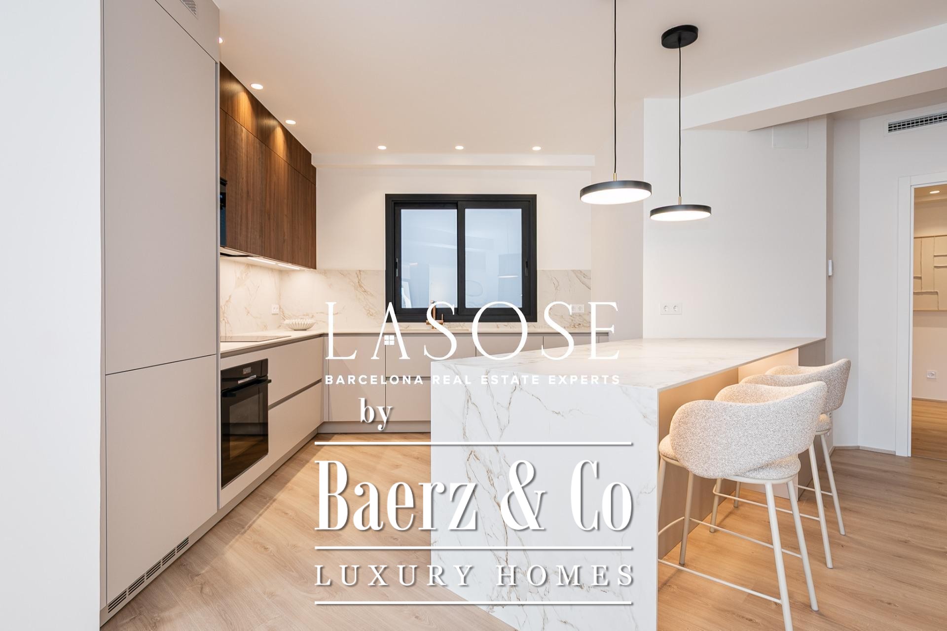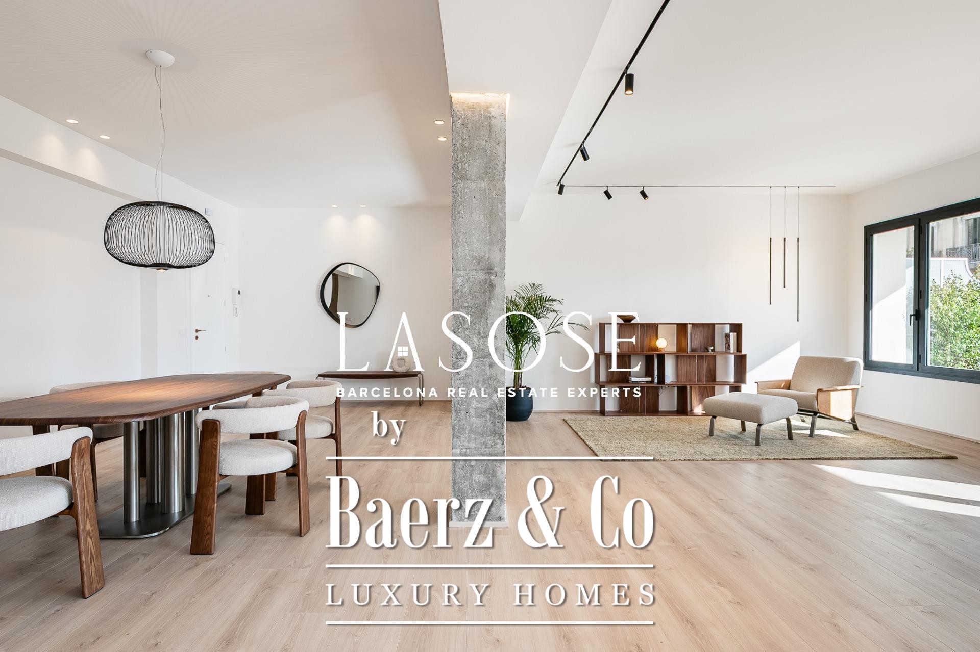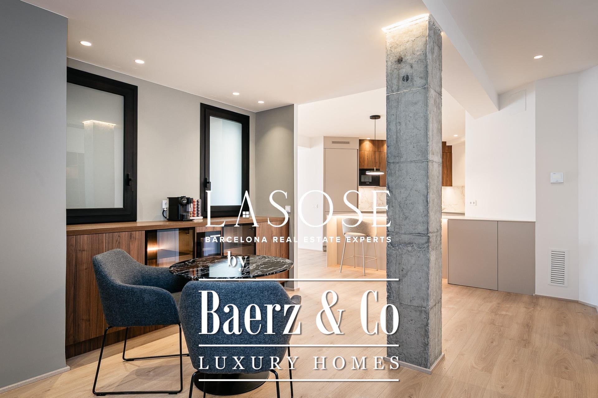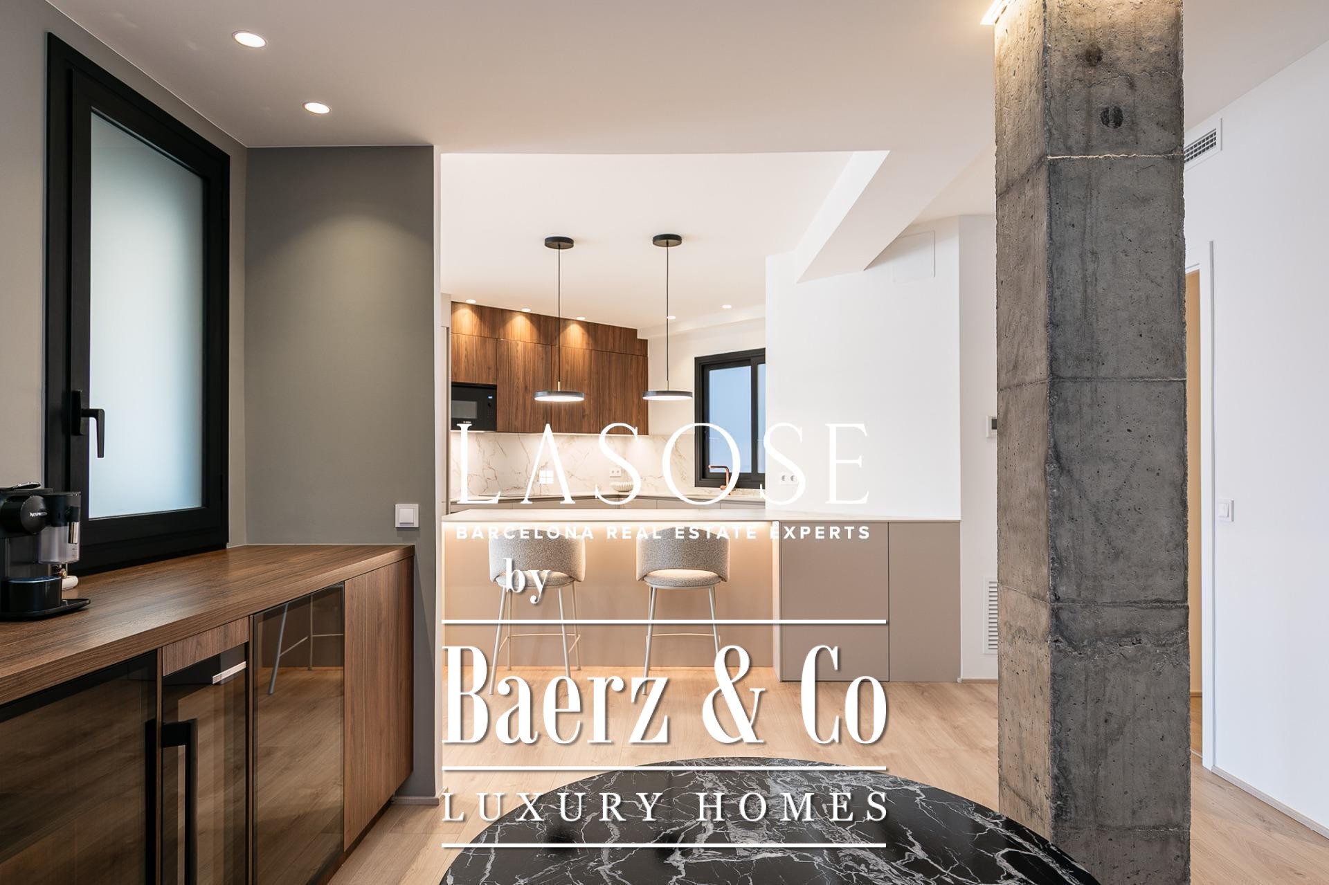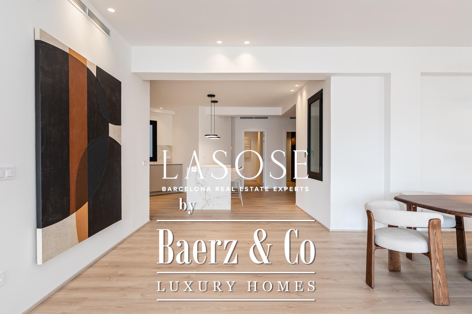 公寓经过全面翻新,甄选高端材质。宽大的东南朝向落地窗让阳光洒满慷慨的室内空间以及开放式的90平方米客餐厅。起居室的门直通转角全景露台,可俯瞰绿树成荫的林荫大道与Plaça Mossèn Jacint Verdaguer广场。厨房由Santos设计,配备Bosch家电,中心为社交中岛,内设酒窖与咖啡区,旁设储藏室,保证收纳私密。
