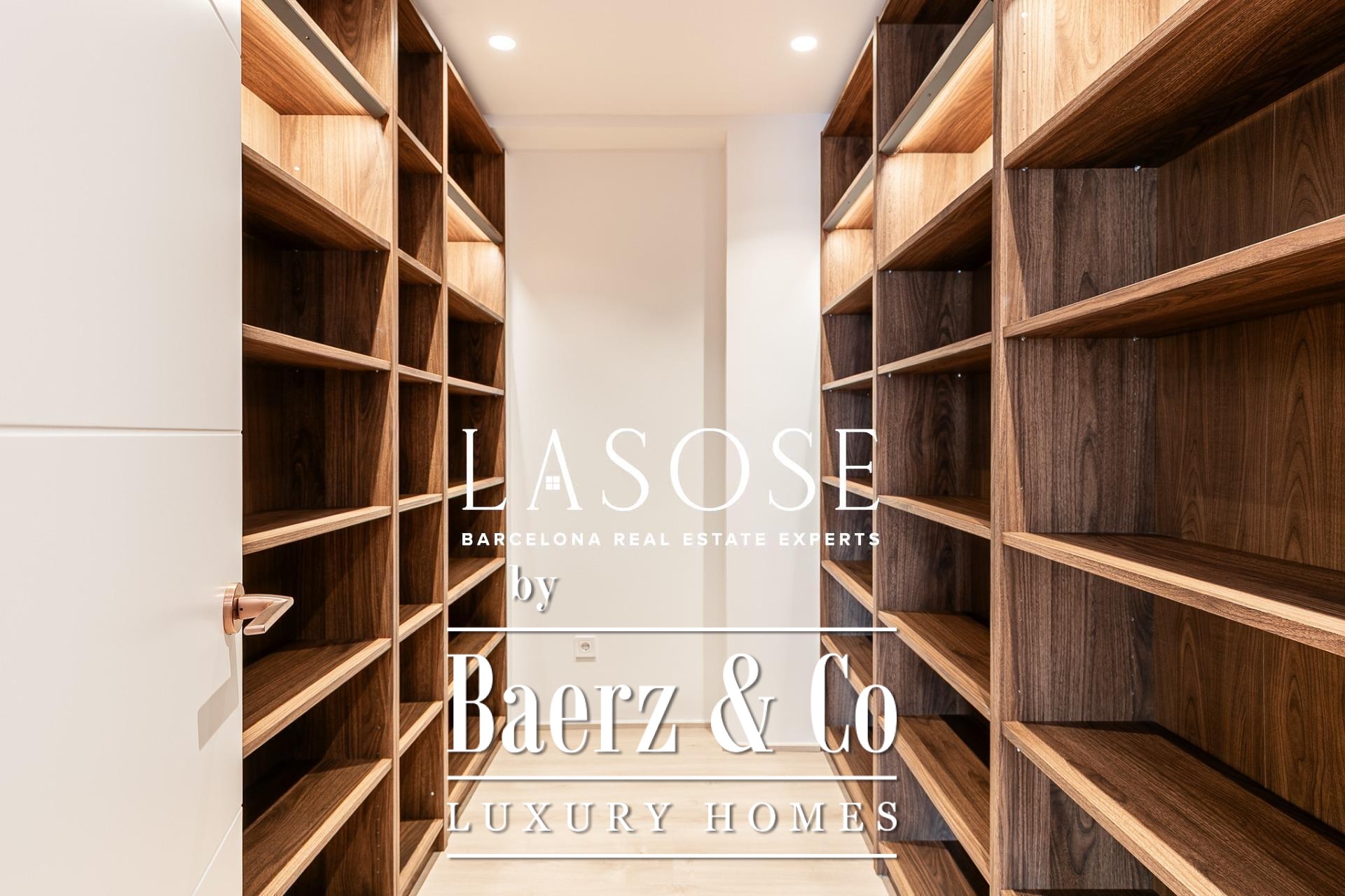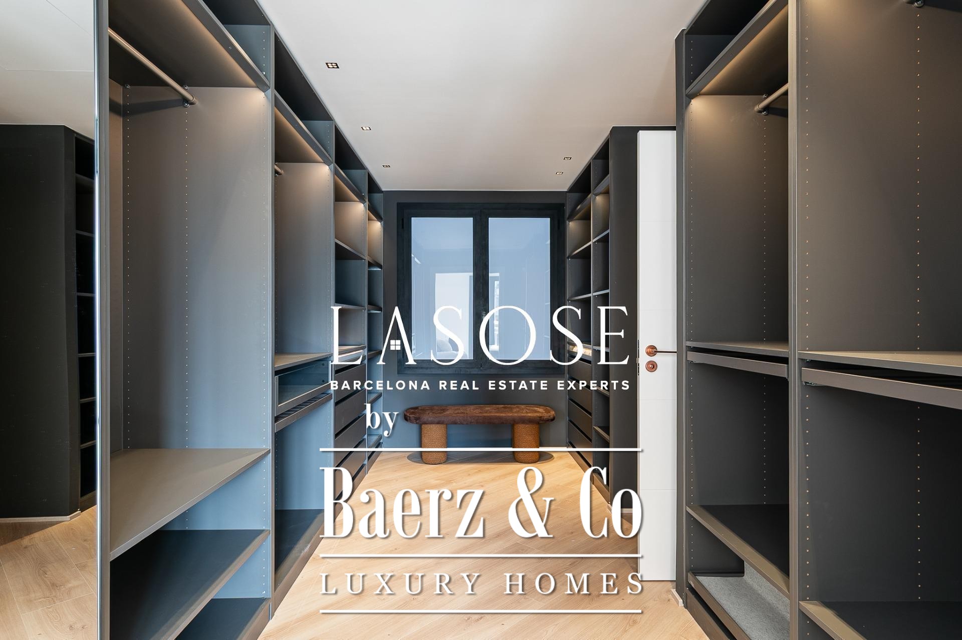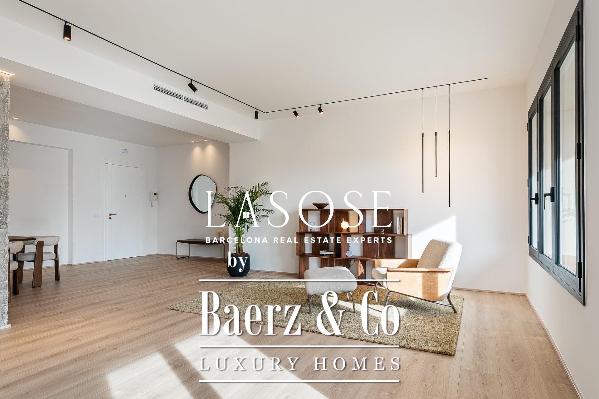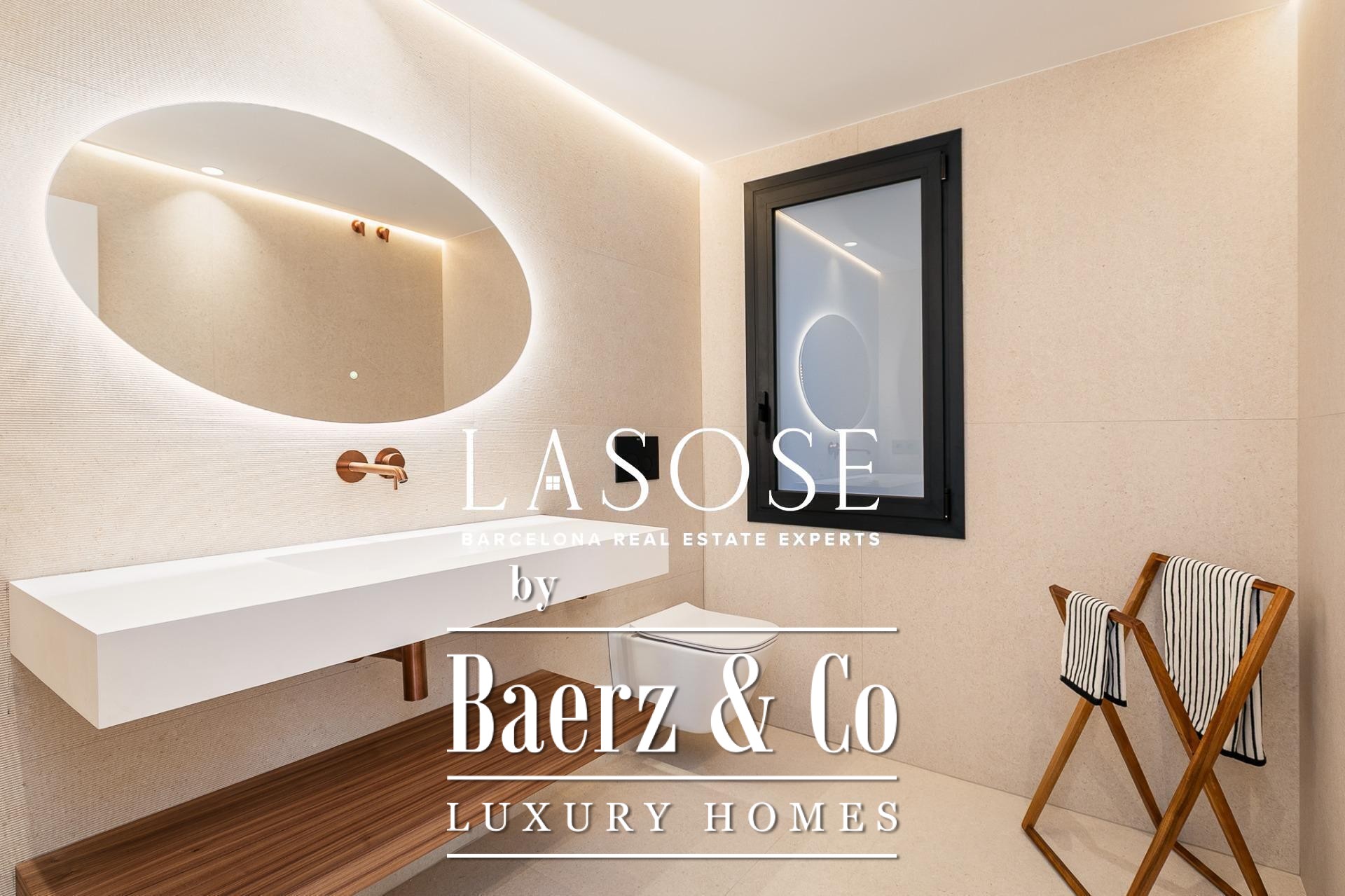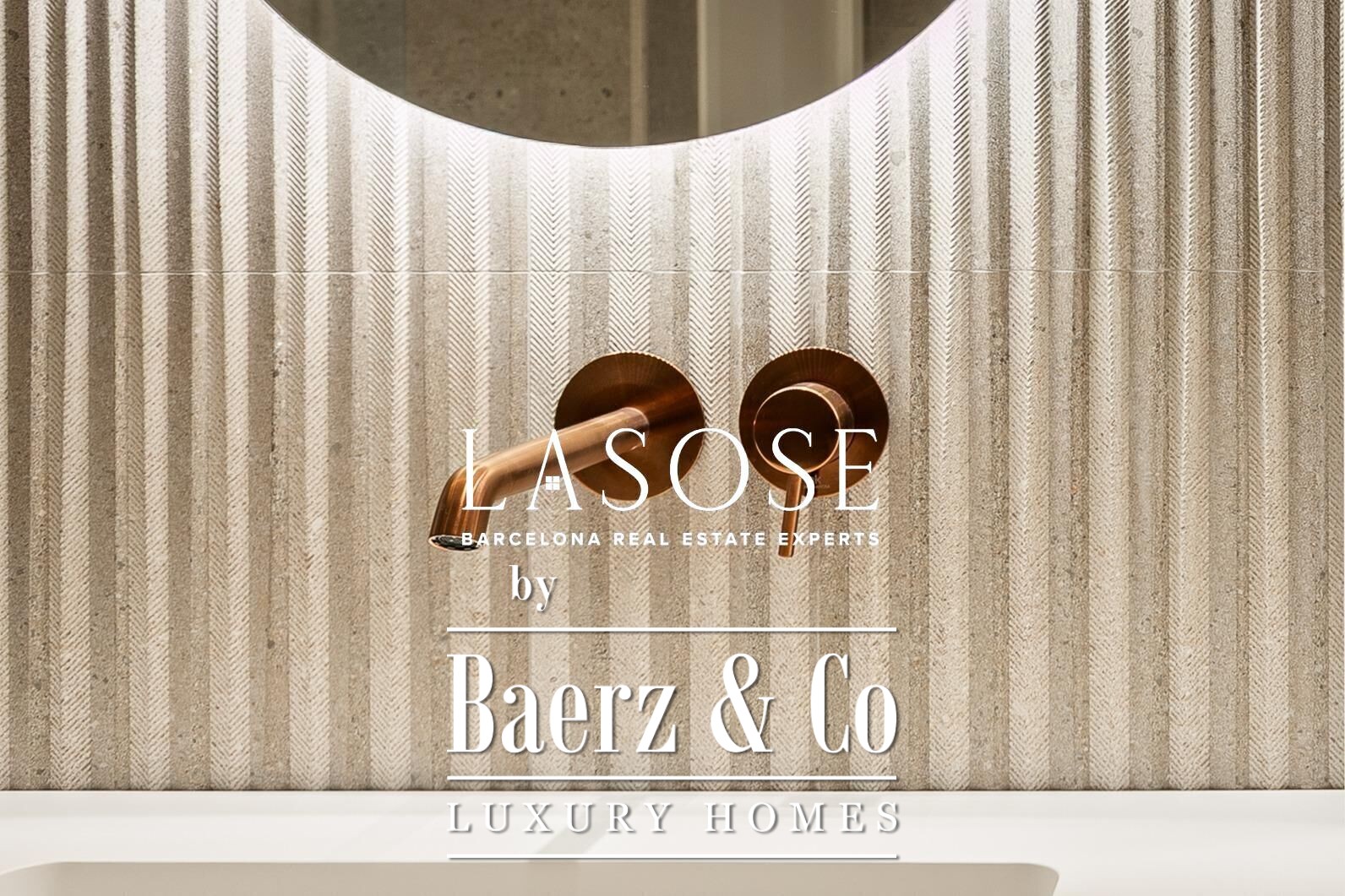 公寓经过全面翻新,甄选高端材质。宽大的东南朝向落地窗让阳光洒满慷慨的室内空间以及开放式的90平方米客餐厅。起居室的门直通转角全景露台,可俯瞰绿树成荫的林荫大道与Plaça Mossèn Jacint Verdaguer广场。厨房由Santos设计,配备Bosch家电,中心为社交中岛,内设酒窖与咖啡区,旁设储藏室,保证收纳私密。