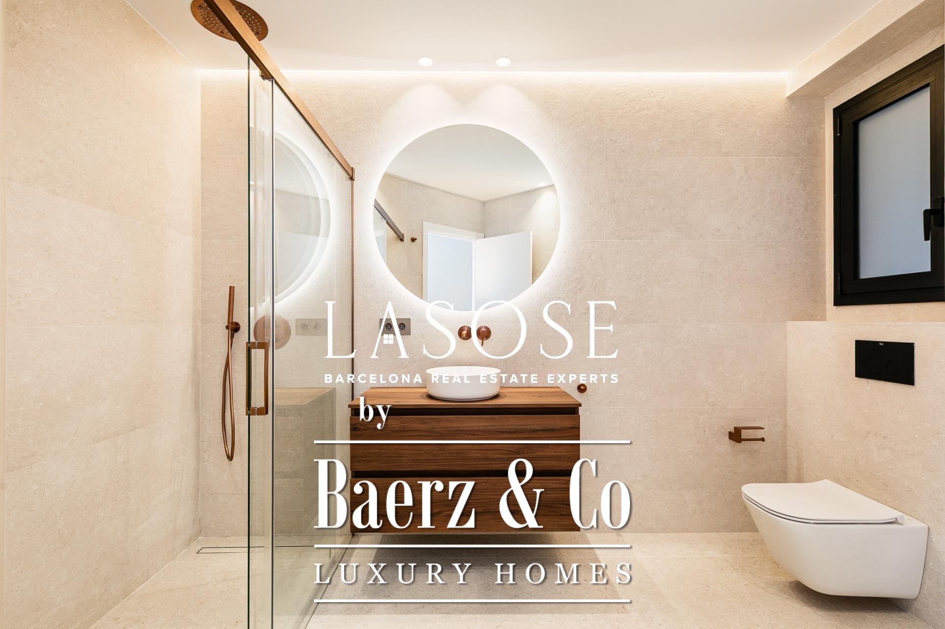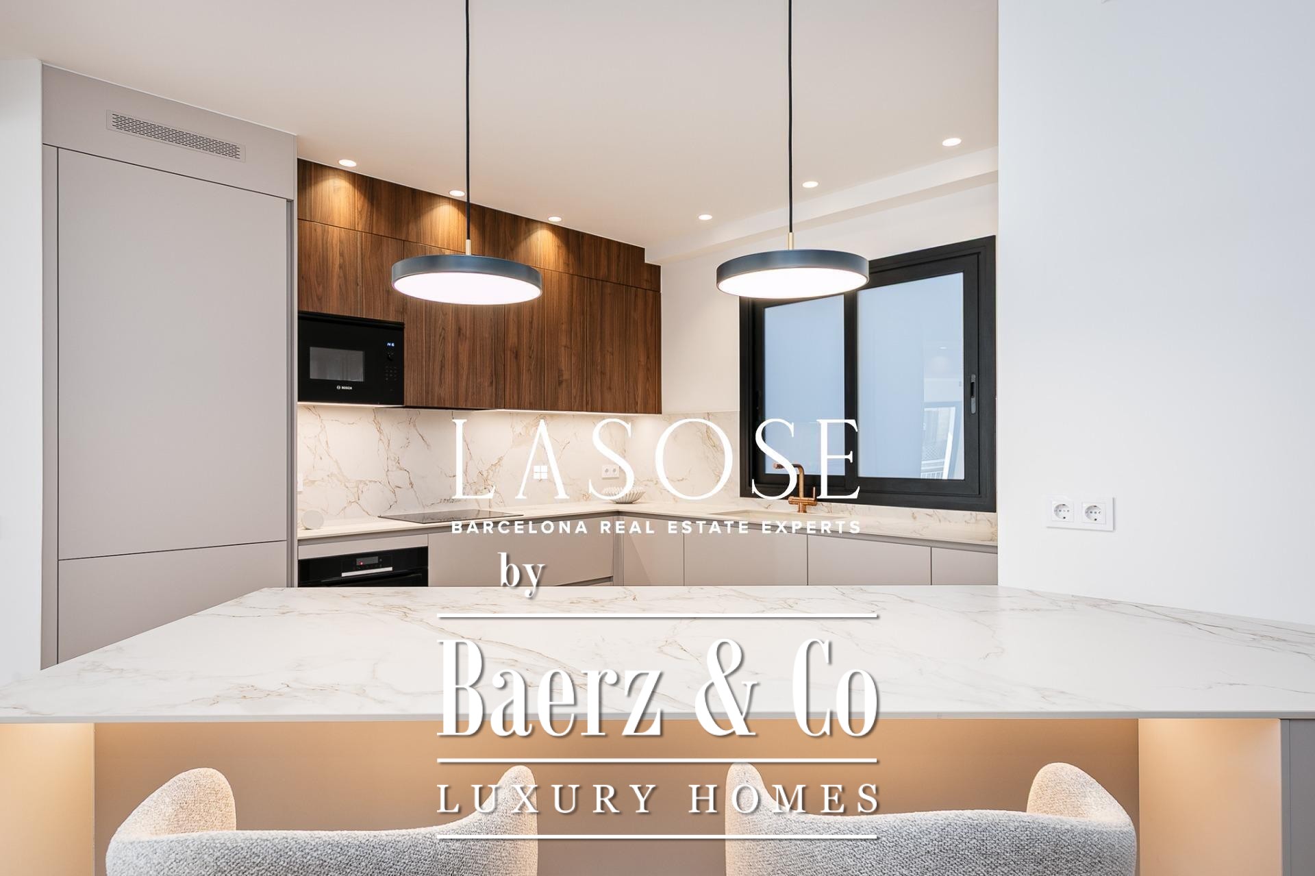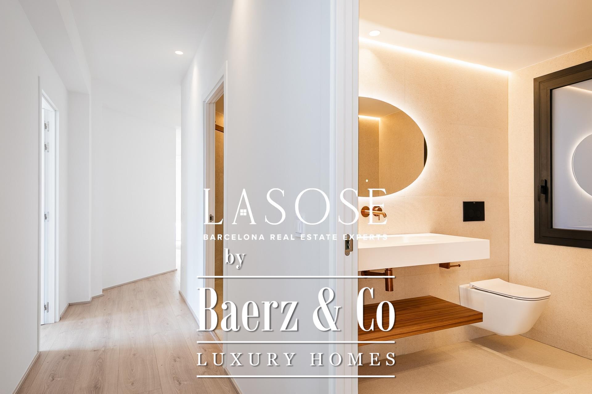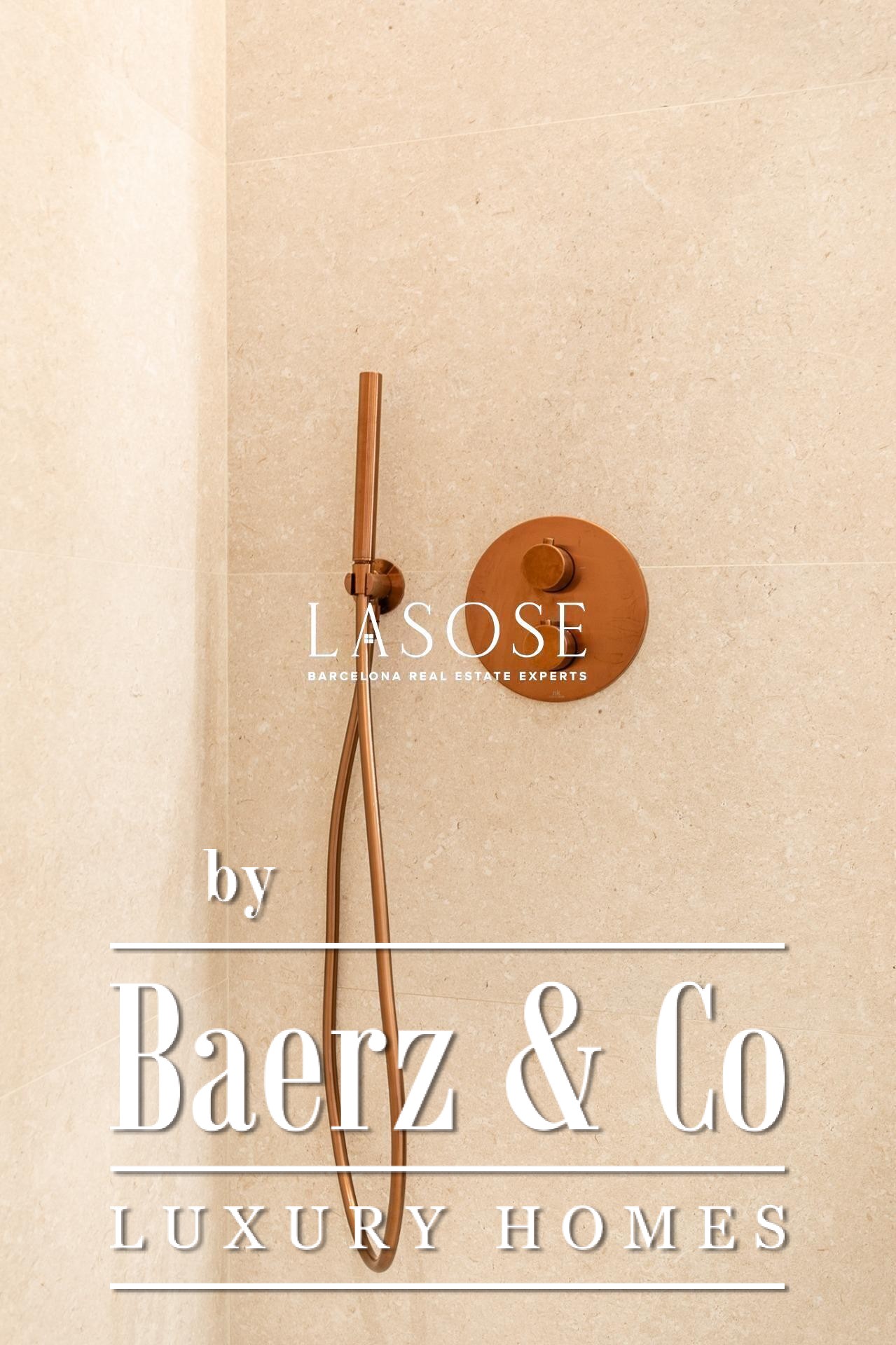 公寓经过全面翻新,甄选高端材质。宽大的东南朝向落地窗让阳光洒满慷慨的室内空间以及开放式的90平方米客餐厅。起居室的门直通转角全景露台,可俯瞰绿树成荫的林荫大道与Plaça Mossèn Jacint Verdaguer广场。厨房由Santos设计,配备Bosch家电,中心为社交中岛,内设酒窖与咖啡区,旁设储藏室,保证收纳私密。