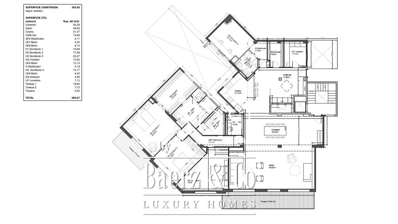 夜间区域设有四间双人卧室。主卧套房拥有私人露台、步入式衣帽间及独立卫浴,浴室配备独立浴缸。次主卧同样为套房,为宾客带来极致舒适;所有卫浴空间均采用Porcelanosa石材及Noken卫浴配件提升格调。住处还包括储藏间、洗衣房、服务区域,并配备先进家居科技:全屋智能系统,Mitsubishi分区空调,空气源热泵供暖及双层玻璃门窗。