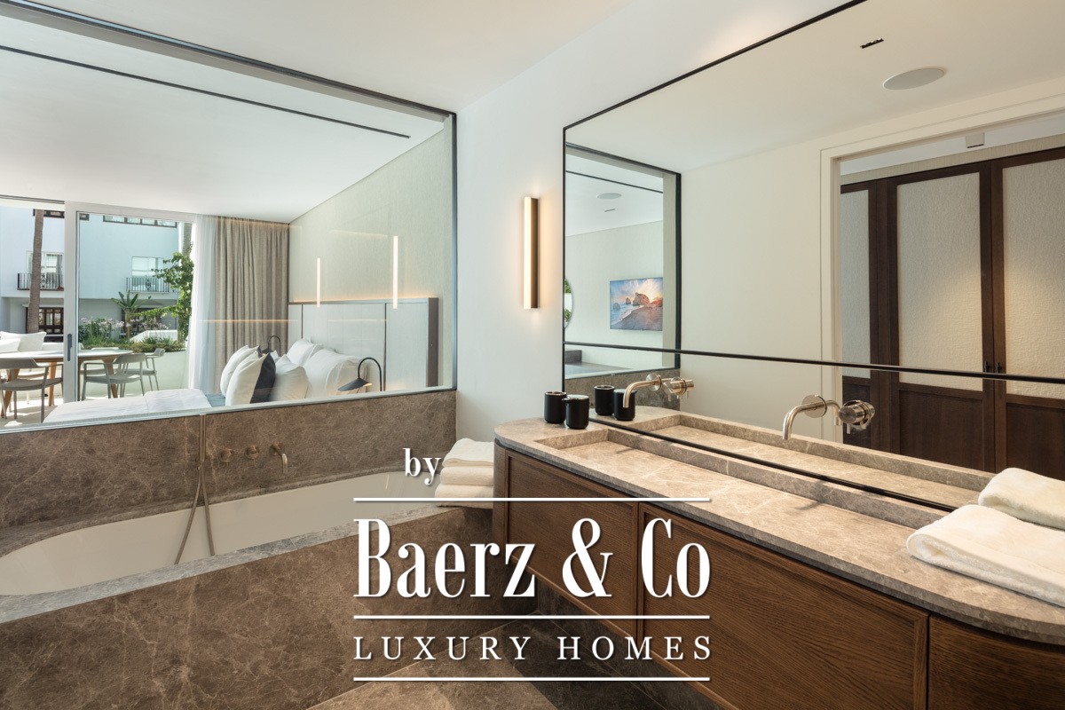 Marbella Golden Mile 公寓坐落于 Puente Romano Resort 内,光线和海风共同营造出低调优雅的氛围。这套 138 平方米的现代公寓拥有明亮通透的开放式起居空间,落地玻璃门让露台、花园与海岸线美景自然延伸至室内。中性色调与天然木地板互相交融,映衬着四周的地中海风貌,使整个居住与私人空间都洋溢着宁静氛围。