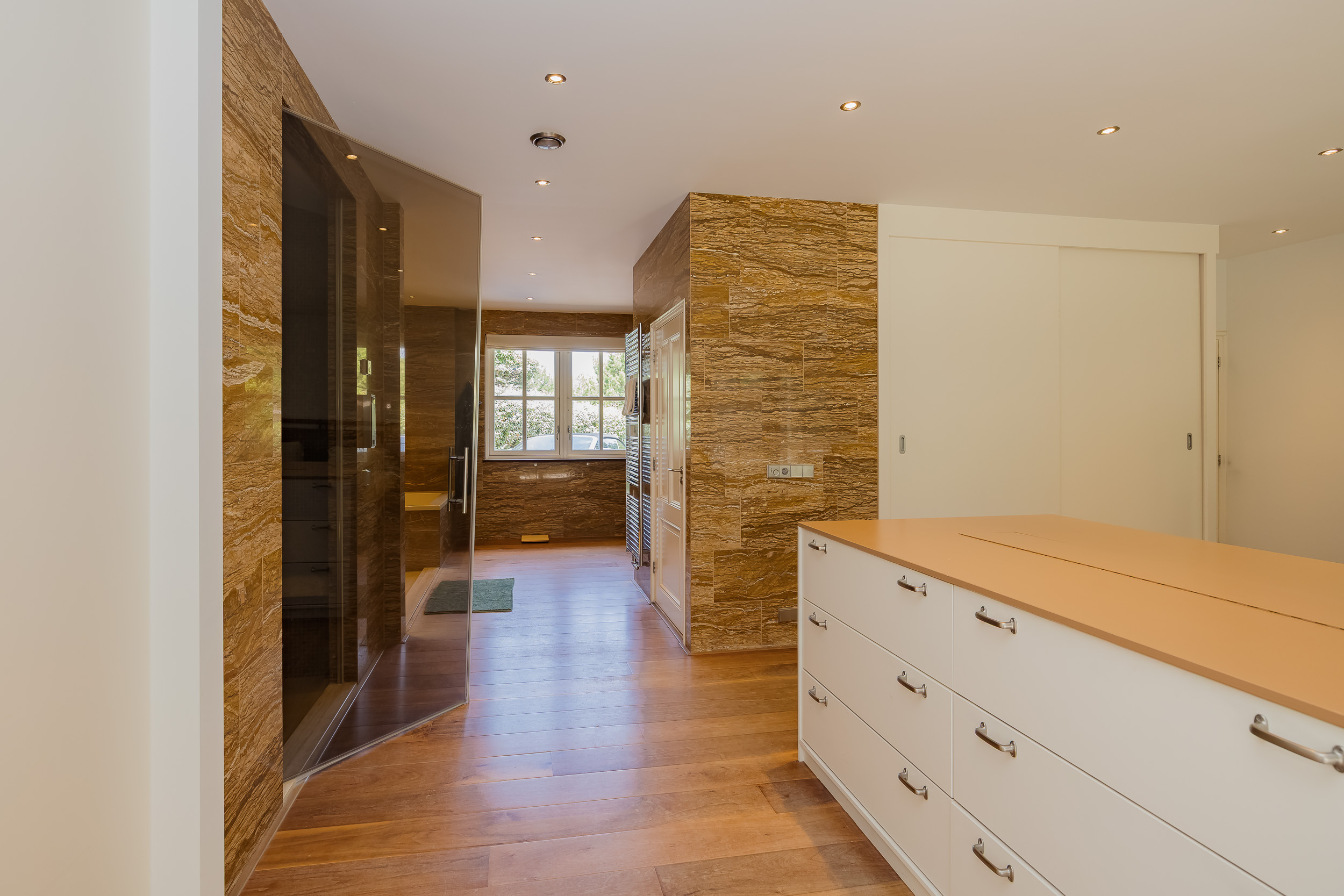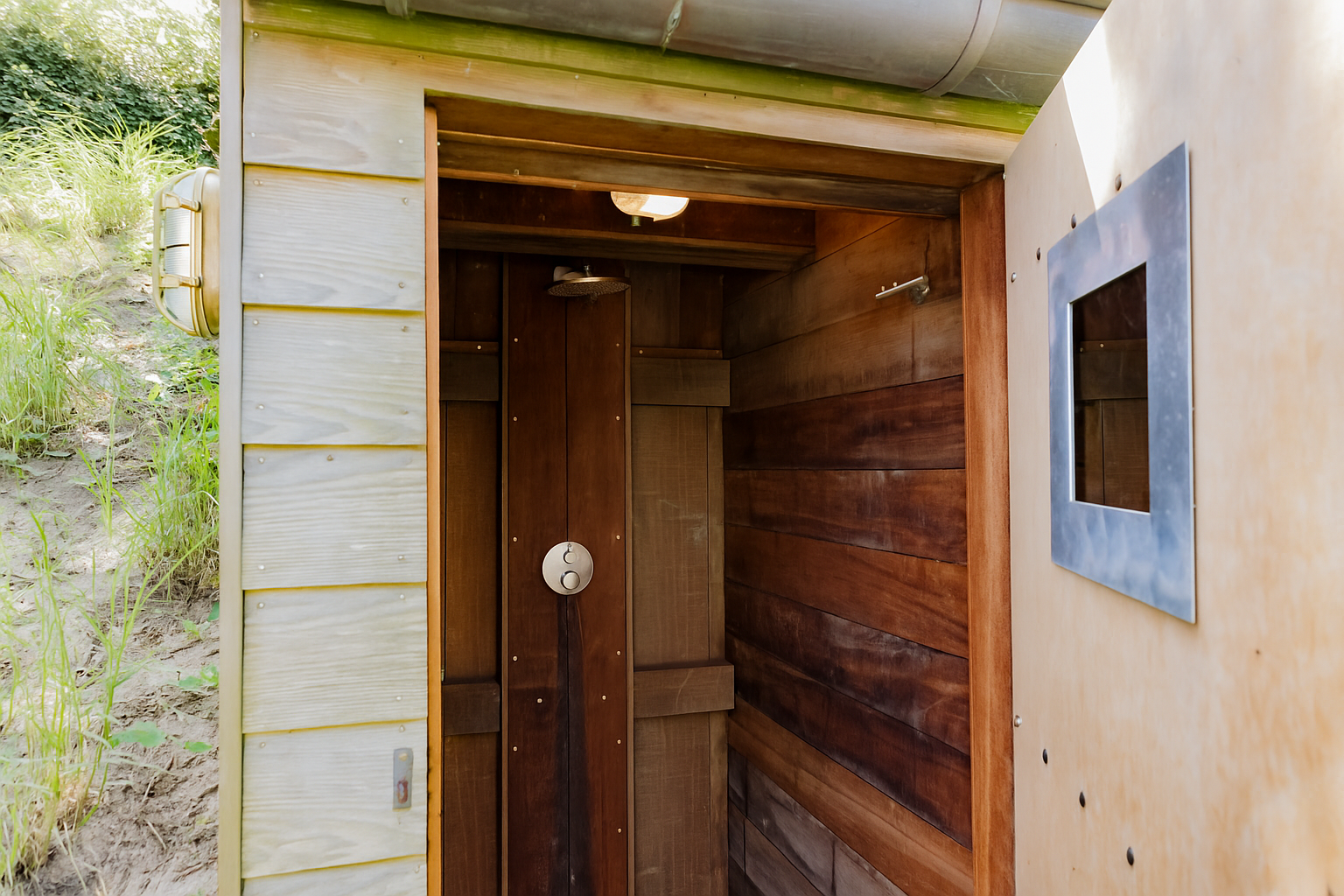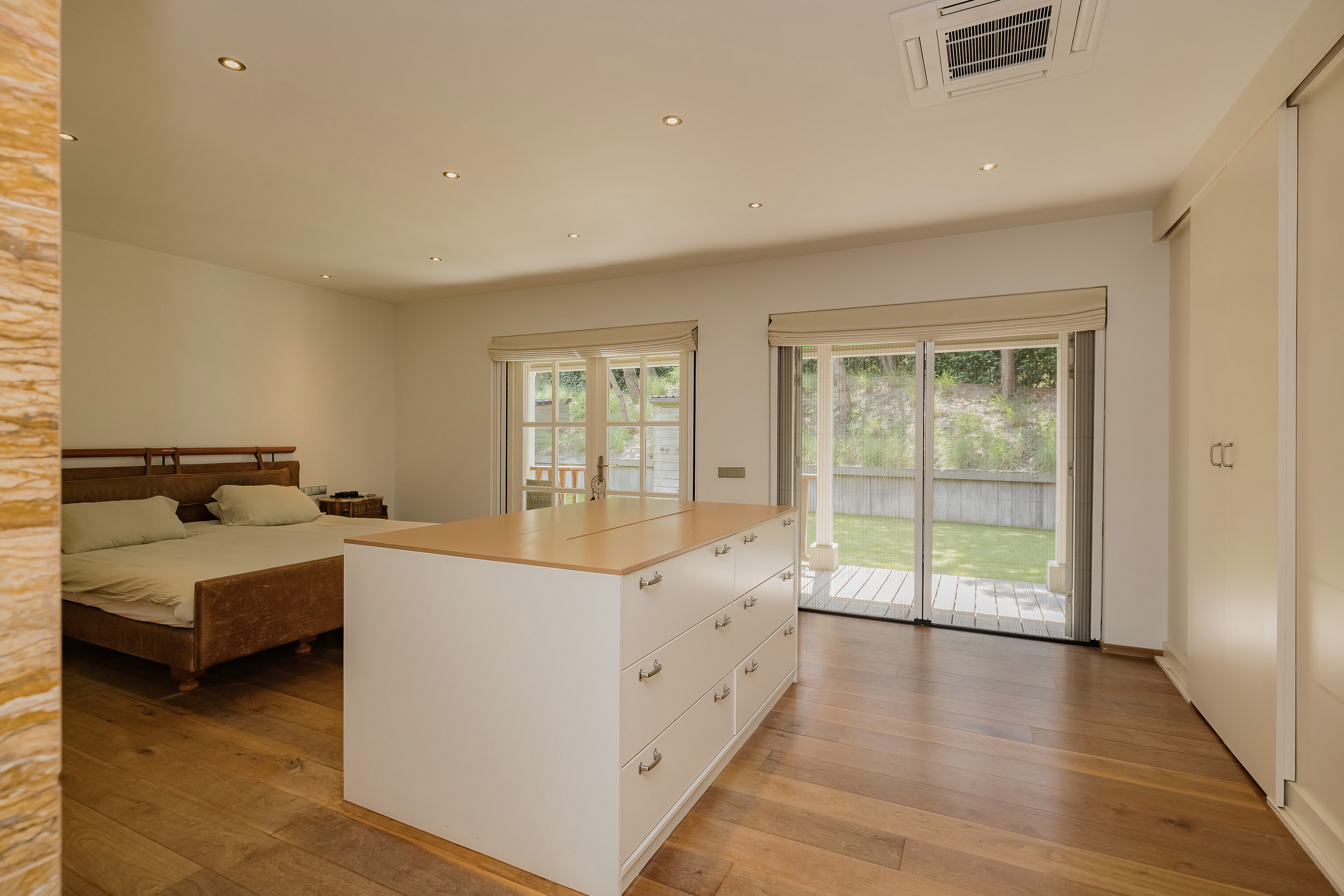 楼上三间带空调的卧室和两间浴室,采用比利时蓝石等天然材质精致打造。主卧套间通向44平方米的硬木露台,铺设Bankirai木地板,静谧与四周沙丘共同塑造每日生活节奏。