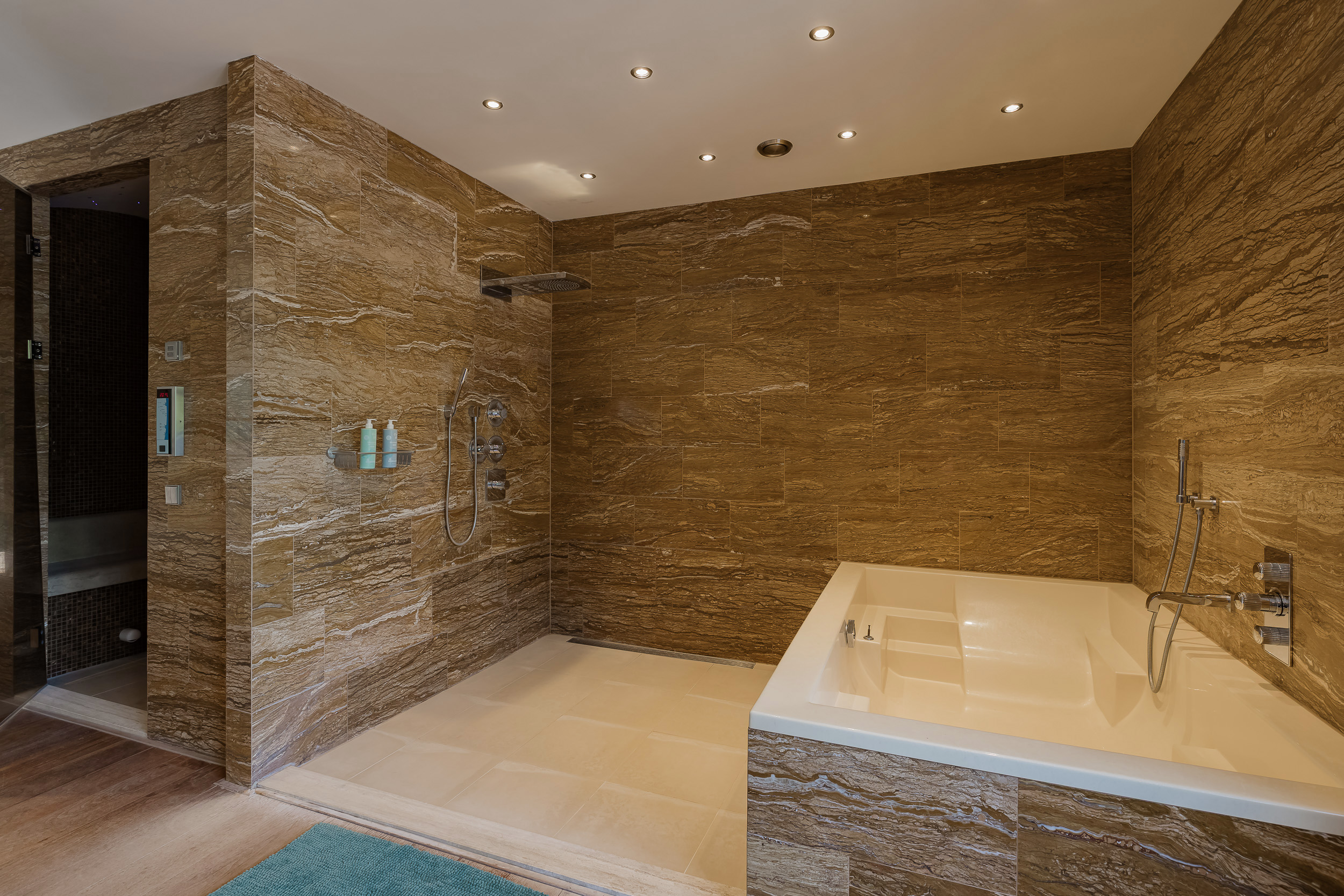底层铺设核桃木地板,专属玄关引入浅小绿乡村厨房,配有六头AGA灶台和四台烤箱。起居室内设有壁炉及法式落地门,直通花园。私密主人套房独立成翼,配备大理石浴室、步入式淋浴间、蒸汽房及定制皮革洗手盆。从这里可走出14平方米的宽大阳台,通过加热器和氛围照明,自然实现室内外的无缝过渡。