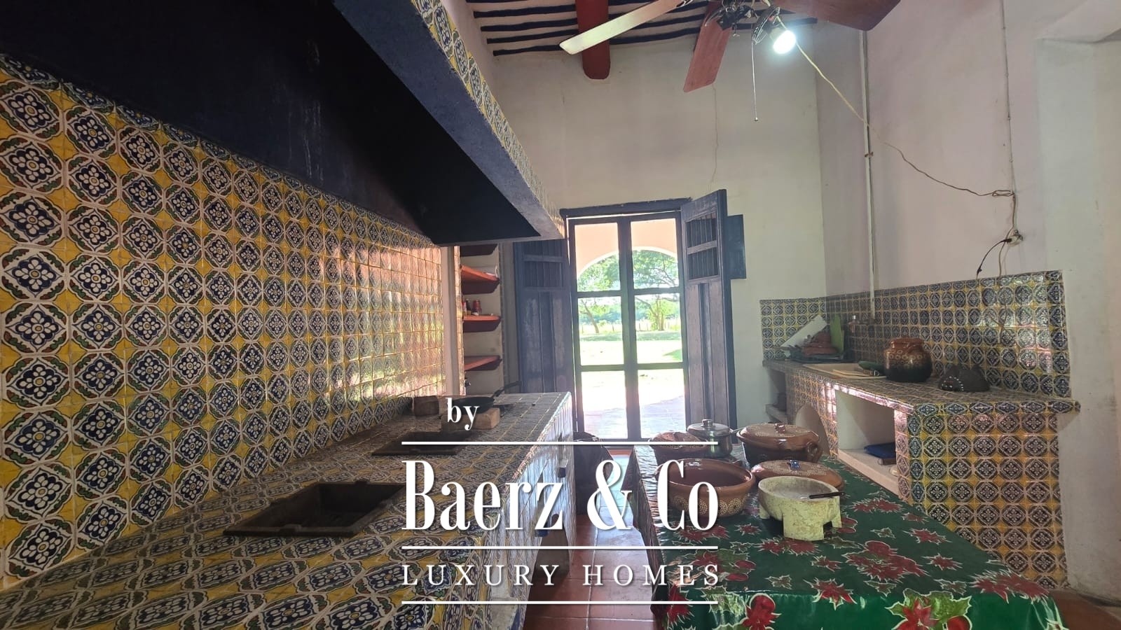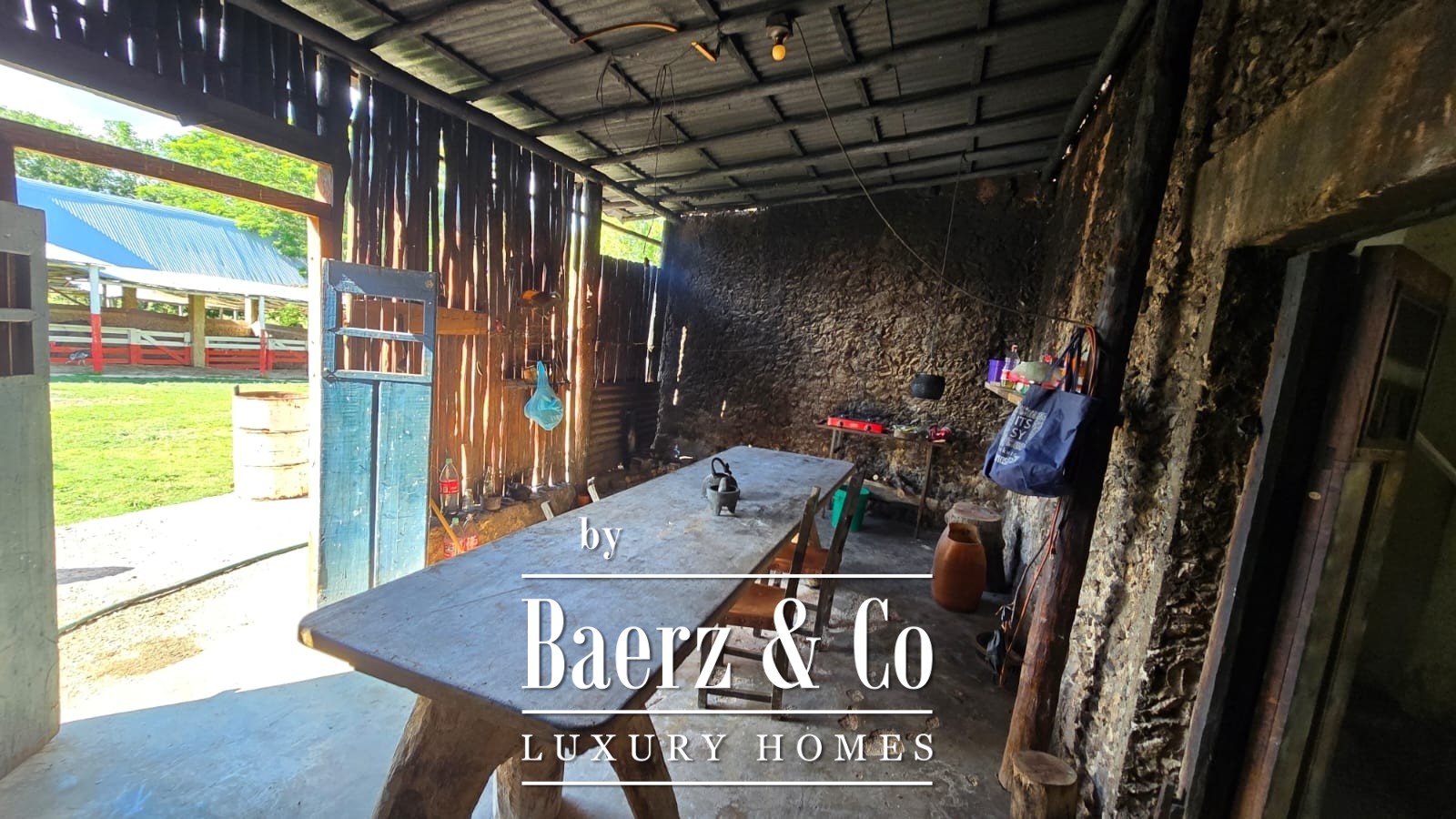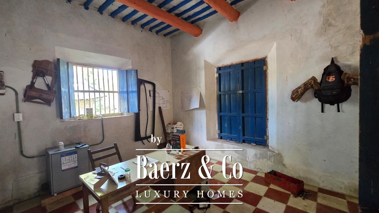 The residential area comprises approximately 650 square meters of buildings. The main hacienda-style house offers a spacious living and dining room, a kitchen with a coal fireplace, gas stove and refrigerator, a master bedroom, two additional rooms, and a full bathroom.