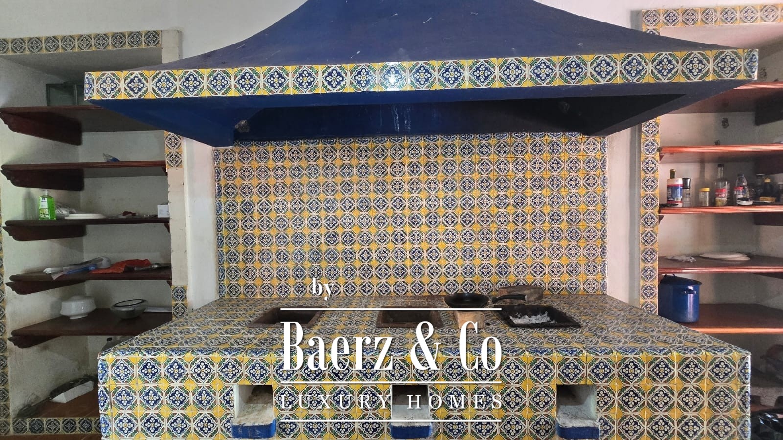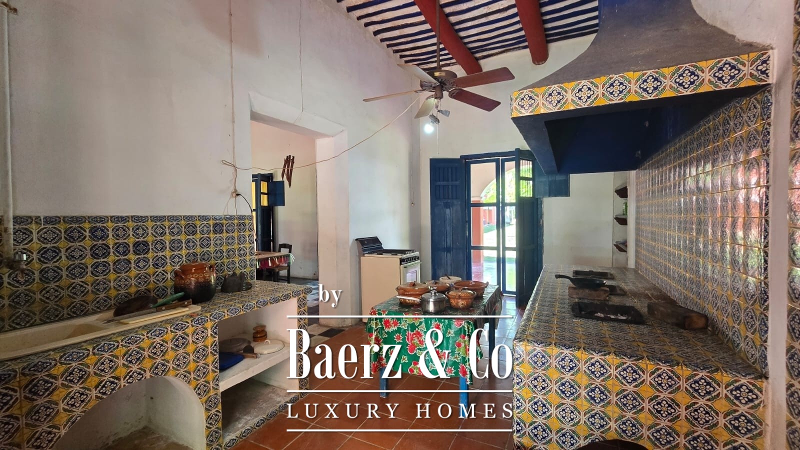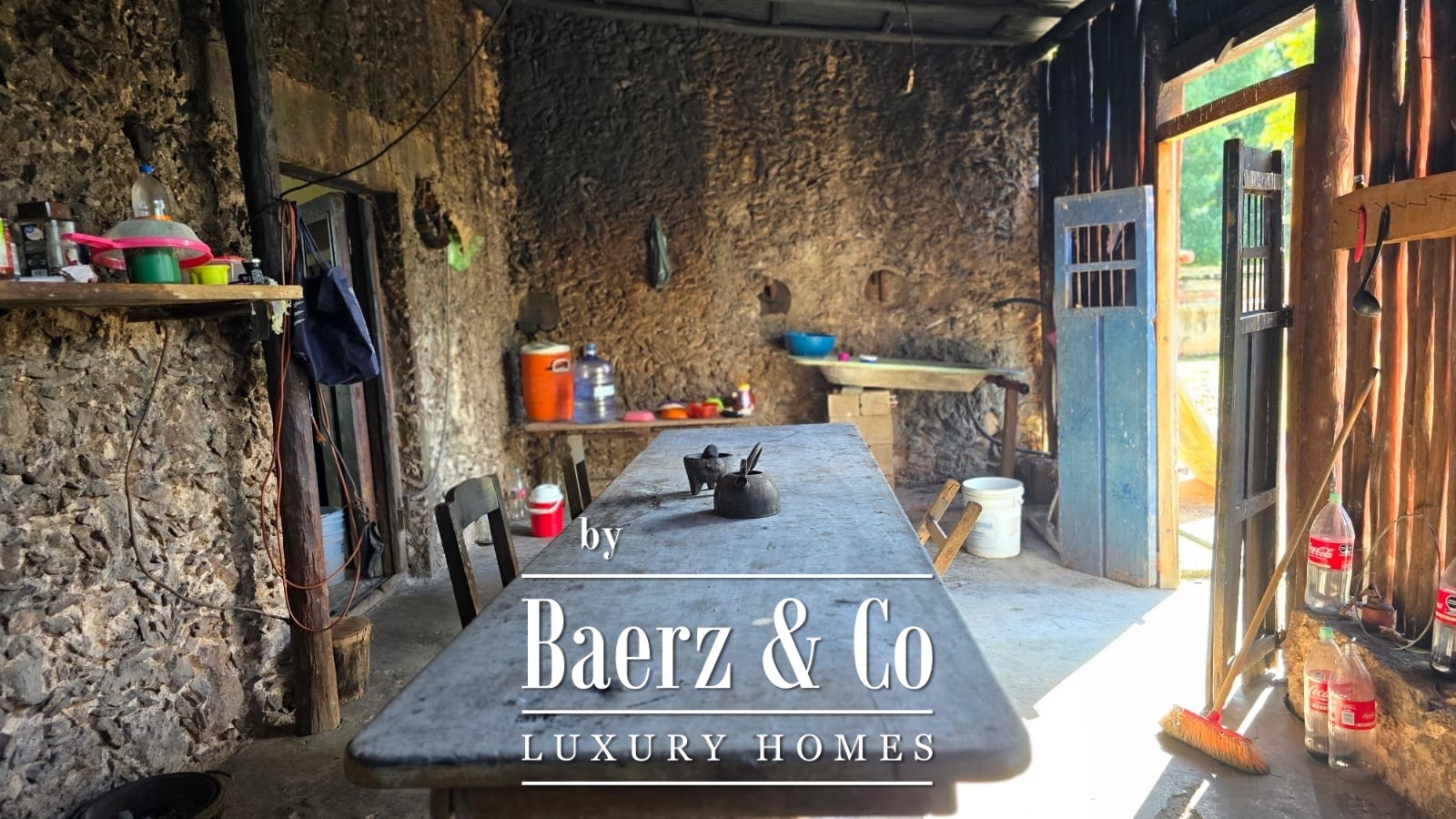 The residential area comprises approximately 650 square meters of buildings. The main hacienda-style house offers a spacious living and dining room, a kitchen with a coal fireplace, gas stove and refrigerator, a master bedroom, two additional rooms, and a full bathroom.