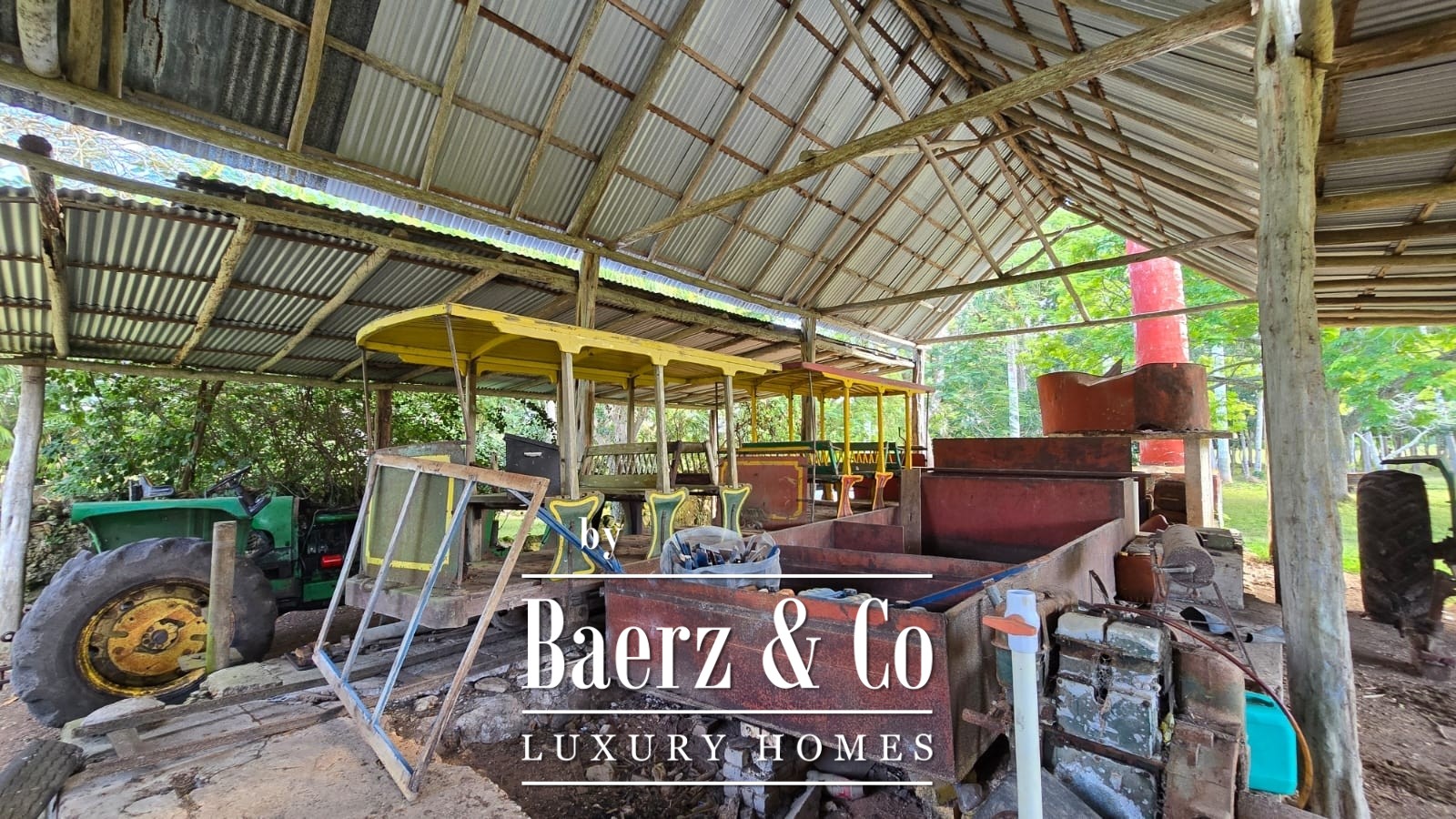 The property includes two sheds for machinery and tractors. These include a working Komatsu tractor and two John Deere tractors, one large and one small. The Komatsu and one of the John Deere tractors are currently operational, while the others require minor maintenance. Rails, vintage trucks, and various other implements are also on site.