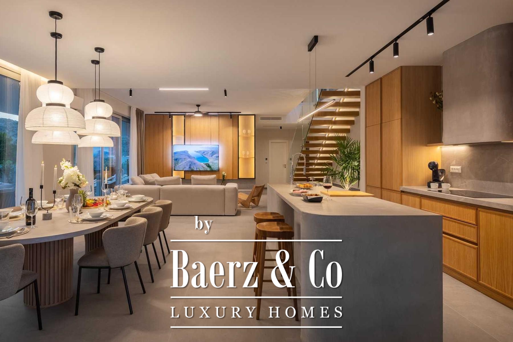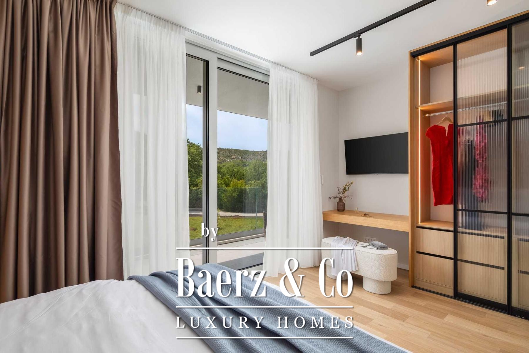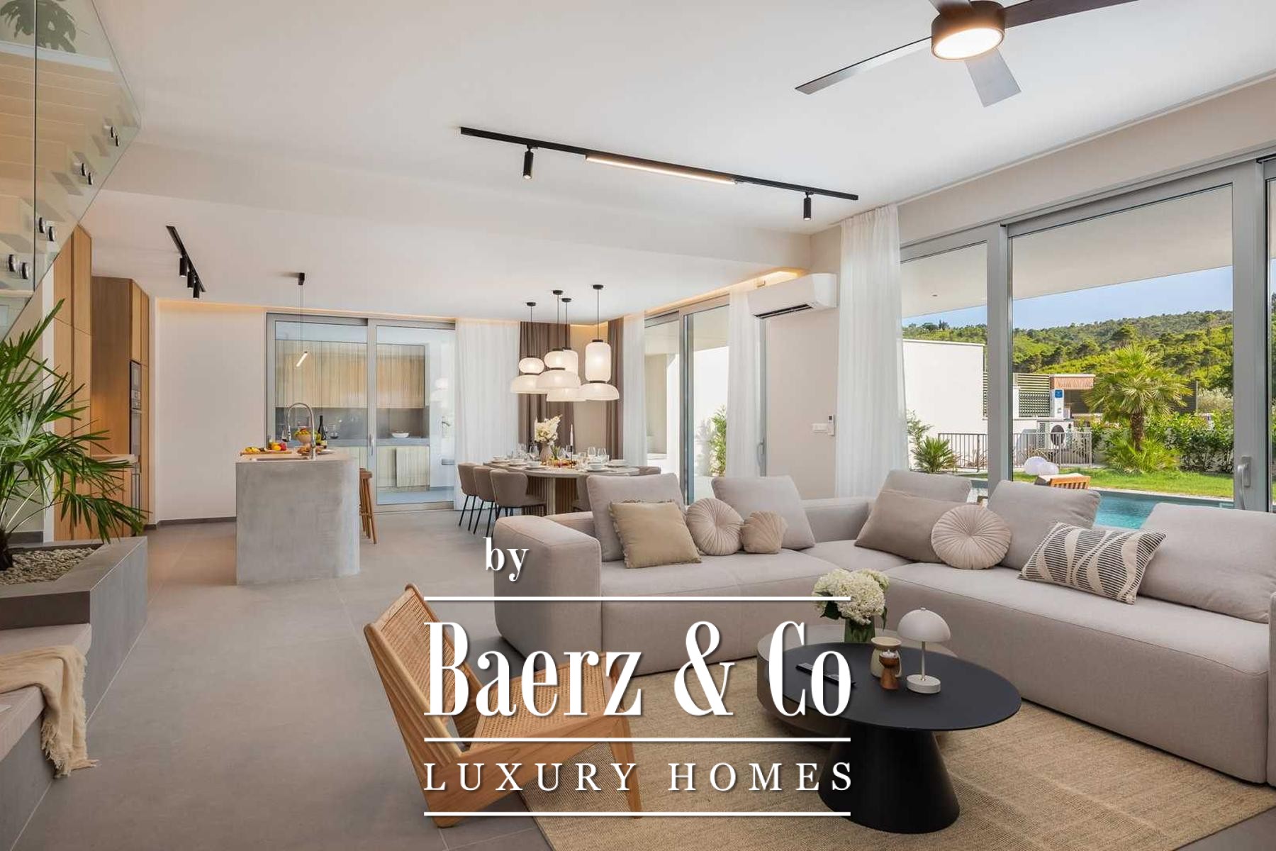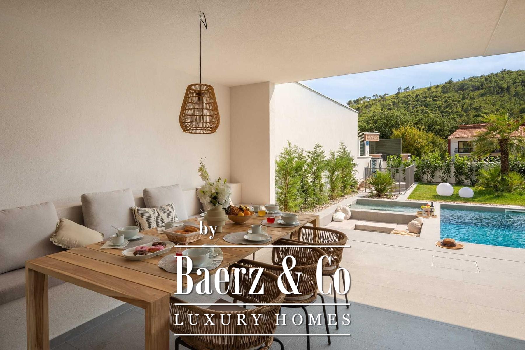 Located in a quiet area in the surroundings of Split, on a spacious plot of 2,090 m², this modern and luxuriously appointed villa with a heated swimming pool offers exceptional comfort, privacy, and functionality. The property is arranged over two floors and is ideal for both private living and high-end rental purposes.The ground floor consists of an entrance hall, a fitness room with sauna, a bathroom, a separate toilet, and a spacious open-plan living area comprising a fully equipped kitchen, dining area, and living room. Large glass walls allow abundant natural light and create a seamless connection between the interior and exterior spaces. From the kitchen, there is access to a covered terrace with an outdoor kitchen and barbecue, while the dining and living areas open onto an additional covered terrace leading to the sun deck and heated swimming pool.The upper floor is dedicated to the sleeping area and features four bedrooms, each with its own en-suite bathroom, as well as a shared storage room.The villa has been designed with great attention to detail, harmoniously combining contemporary design, high-quality materials, and functionality.In addition to the swimming pool and sunbathing area, the fully fenced and landscaped garden offers a children’s playground (football and basketball), a bocce court, and ample parking space for several vehicles.The property enjoys an excellent location, providing peace and privacy while remaining within easy reach of all amenities and infrastructure offered by the city of Split.For further information or to arrange a viewing, please feel free to contact us.