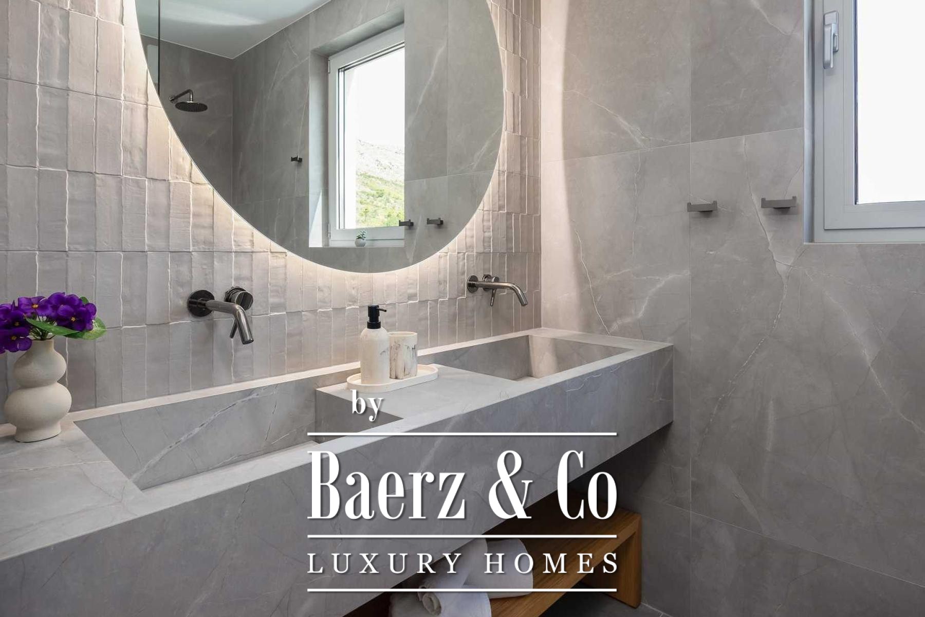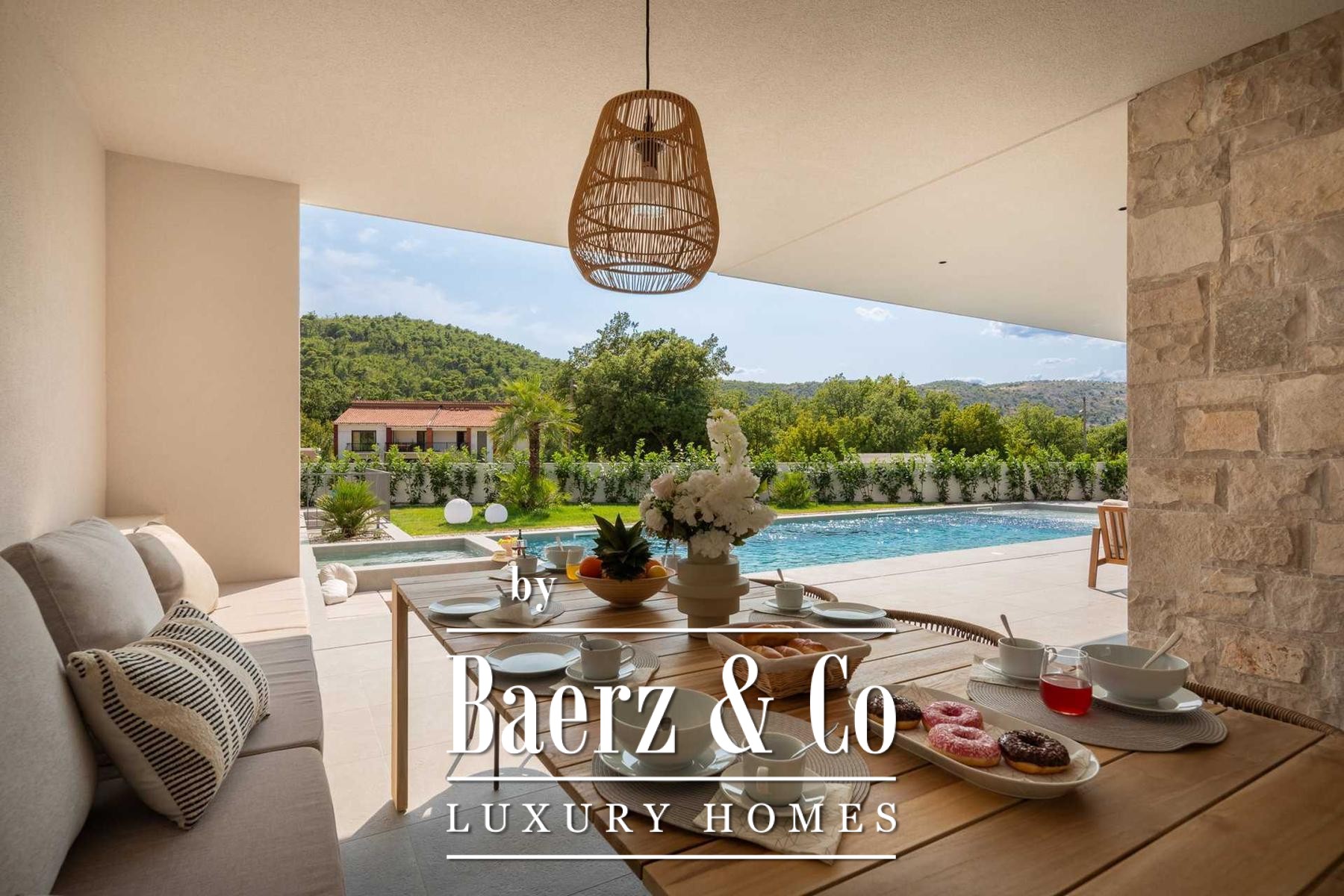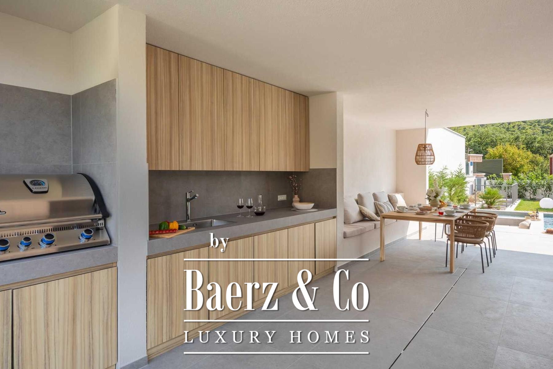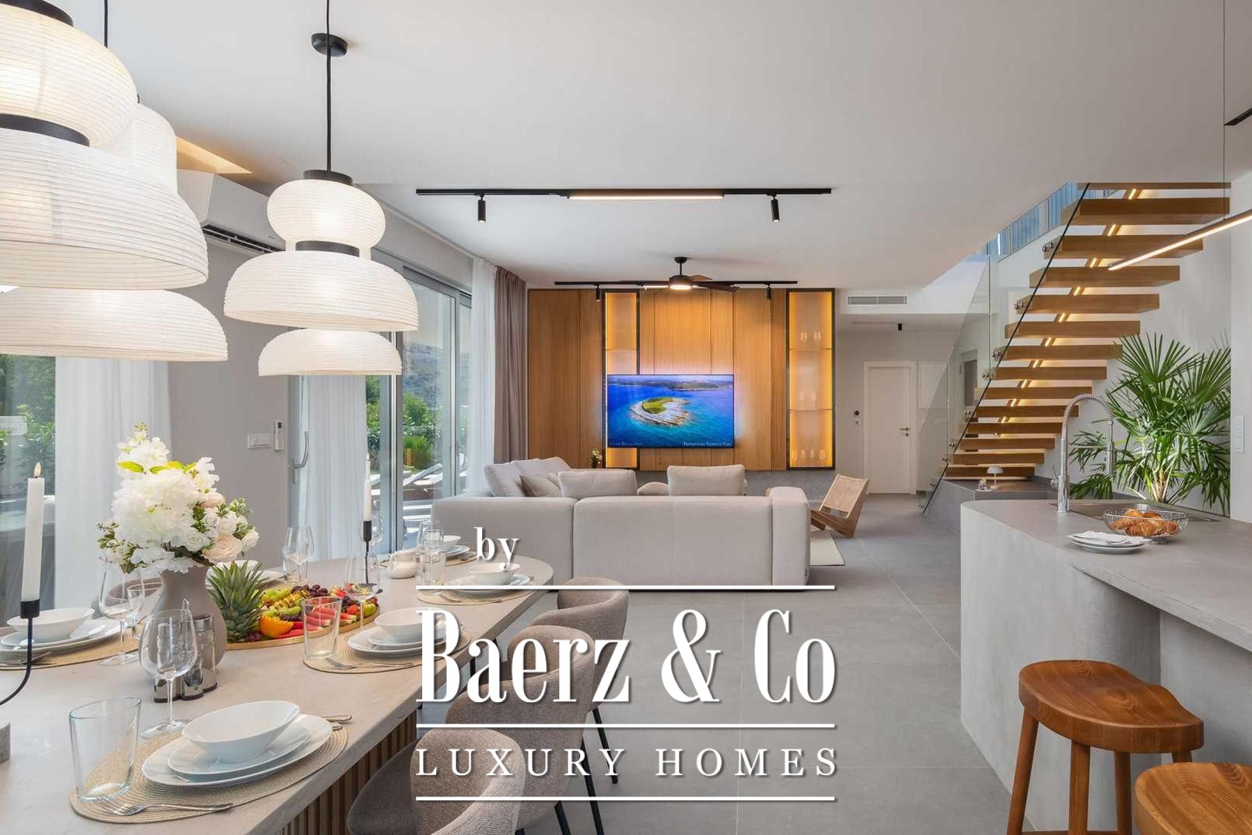 Located in a quiet area in the surroundings of Split, on a spacious plot of 2,090 m², this modern and luxuriously appointed villa with a heated swimming pool offers exceptional comfort, privacy, and functionality. The property is arranged over two floors and is ideal for both private living and high-end rental purposes.The ground floor consists of an entrance hall, a fitness room with sauna, a bathroom, a separate toilet, and a spacious open-plan living area comprising a fully equipped kitchen, dining area, and living room. Large glass walls allow abundant natural light and create a seamless connection between the interior and exterior spaces. From the kitchen, there is access to a covered terrace with an outdoor kitchen and barbecue, while the dining and living areas open onto an additional covered terrace leading to the sun deck and heated swimming pool.The upper floor is dedicated to the sleeping area and features four bedrooms, each with its own en-suite bathroom, as well as a shared storage room.The villa has been designed with great attention to detail, harmoniously combining contemporary design, high-quality materials, and functionality.In addition to the swimming pool and sunbathing area, the fully fenced and landscaped garden offers a children’s playground (football and basketball), a bocce court, and ample parking space for several vehicles.The property enjoys an excellent location, providing peace and privacy while remaining within easy reach of all amenities and infrastructure offered by the city of Split.For further information or to arrange a viewing, please feel free to contact us.